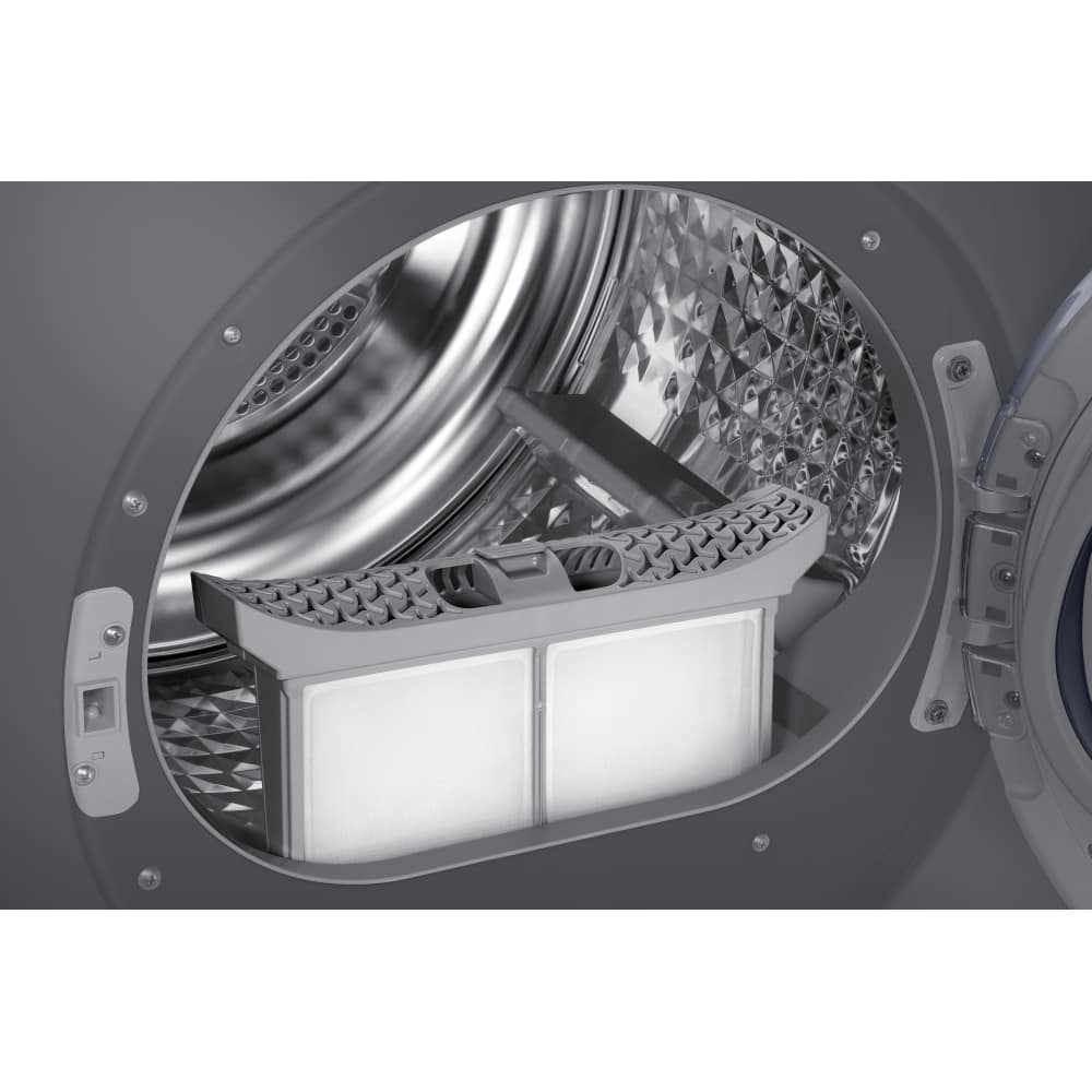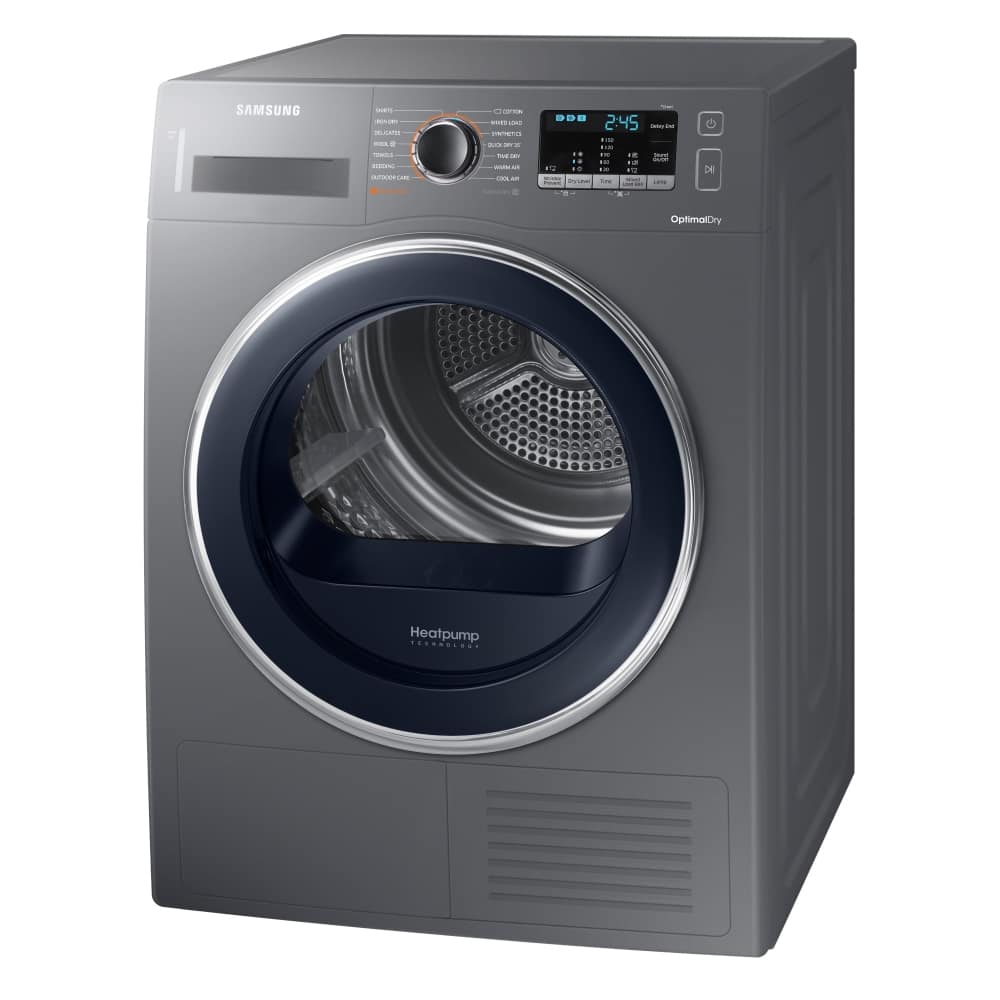 This Samsung freestanding heat pump condensor dryer has a capacity of 8kg. It is A++ rated for energy efficiency and is finished in graphite.