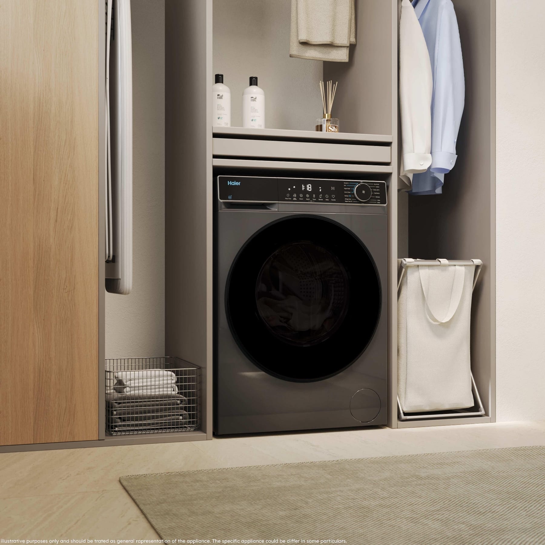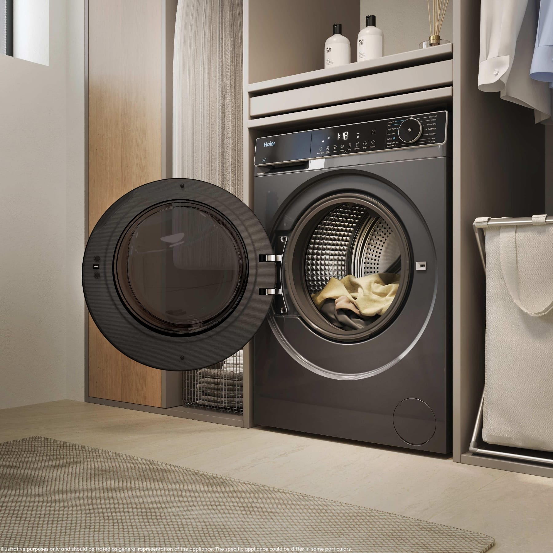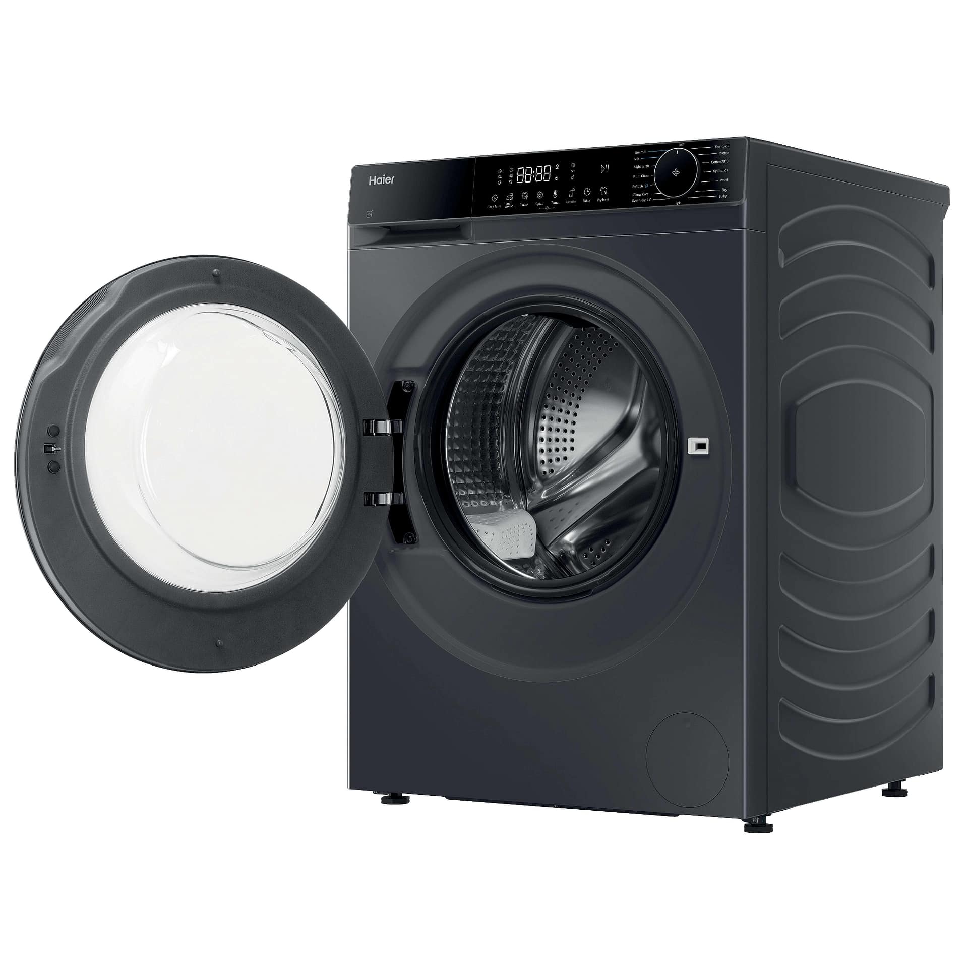 This Haier washer dryer, finished in graphite, has a 9kg wash load and a 5kg drying capacity. Haier design all of their laundry products to provide a professional level clean, within the comfort of your own home. The drum is specially designed to allow delicate garments to gently glide over the pillow shaped pads that cover the drum surface. Whilst the drum spins, your laundry is in safe hands with no chance of catching or snagging.