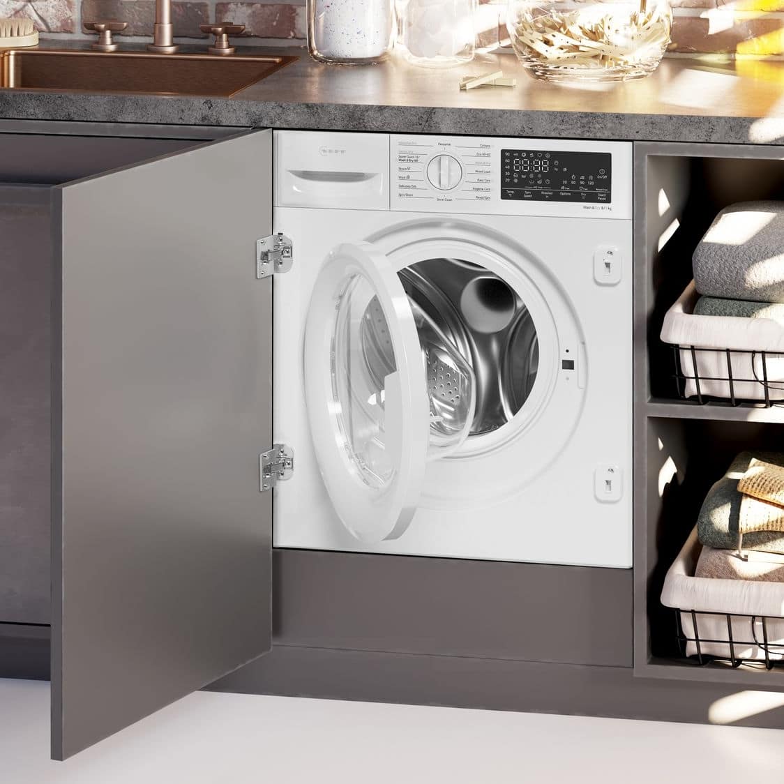 This fully integrated washer dryer from Neff is perfect for smaller spaces. With an 8kg wash load and a 5kg drying load, you can get your laundry washed and dried in no time at all. With an LED display for easy use and a great range of programmes offered, you can easily pick the one you need, whether you are cleaning delicates, wool or a mixed load. Designed to be hidden behind a furniture door, there are no protrusions, doors or buttons on display, ideal for a sleek and modern kitchen design.