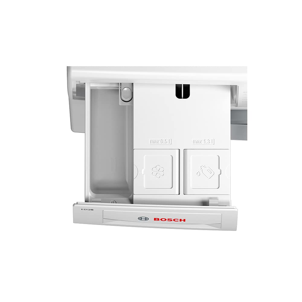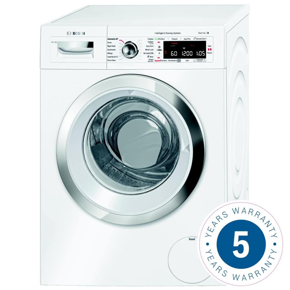 This Bosch Serie 8 i-Dos washing machine is the ideal washing companion for your home. It features Bosch’s i-DOS technology which automatically determines optimal amount of detergent and water for the perfect wash and VarioPerfect technology which ensures top wash results for all types of fabrics and every load. You can set most programs to be quicker or more efficient using SpeedPerfect and EcoPerfect functions, reducing wash time by up to 65% or halving your energy usage. Finally, the Reload function allows you to add clothing of any size to your wash. Simply pause the cycle and your machine will automatically adjust the water level to enable you to open the door.