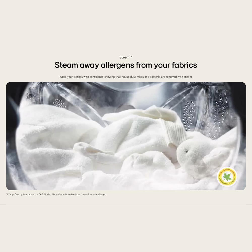 LG pride themselves on their outstanding laundry systems and this 9kg washing machine shows why. Powered by their inverter Direct Drive motor, there’s no belt so no loss of power as electromagnets spin the drum directly for fine control and less vibration. Because of this LG introduced the six motion drum, so each wash utilises the best possible action to clean your clothes, however delicate! LG have also installed their clever Smart Diagnosis technology for easy troubleshooting.