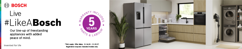 Give your dishes a new lease on life with this Bosch freestanding dishwasher! Finished in white, this dishwasher is the standard 60cm width and has the capacity to store up to 12 place settings. The VarioBasket system offers accessible storage that ensures every item gets fully cleaned no matter where it is placed inside the machine. The top basket is adjustable, allowing for the storage of larger pots and pans. With 6 wash programmes and 3 additional cleaning options available, there’s no residue this washing machine can’t handle. For stubborn messes, use the intensive 70°C cycle to blast away grime with high temperature and increased water pressure. For larger loads, use the ExtraDry function so your plates and glasses are ready to be put away the moment your wash cycle ends. This feature is also particularly useful for difficult to dry materials such as plastic. The SMS26AW08G contains a self-cleaning filter system and is powered by a EcoSilence Drive that delivers high performance at a low noise level. Please note that this model will require a cold-water feed and a waste outlet.