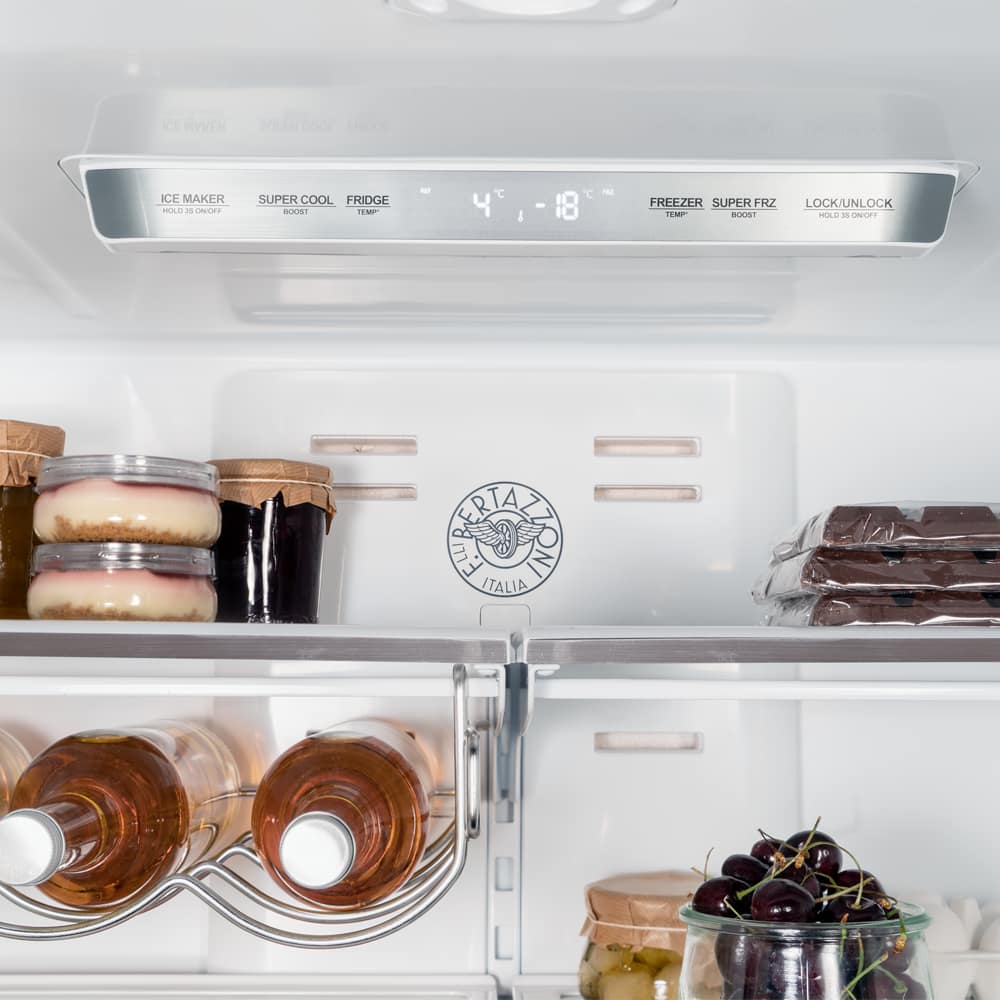 This stunning Bertazzoni French style fridge freezer features a huge 449 litre refrigerator and two pull out freezer drawers totalling 187 litres. The LED lighting floods the interior so no matter how full it is you can always see the contents, and the plumbed in ice maker can provide you with ice whenever you want it. This model has three options on the handles to best suit your kitchen, choose between Master series, Professional or Heritage.