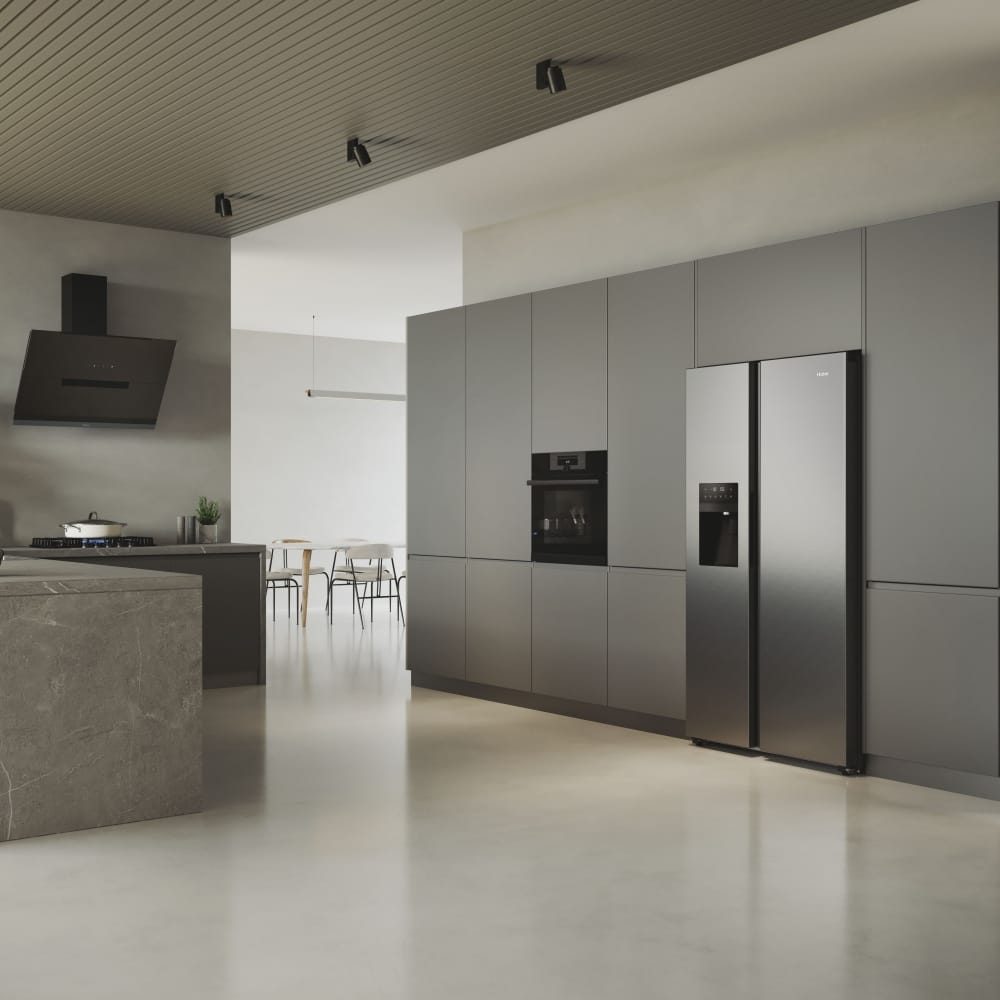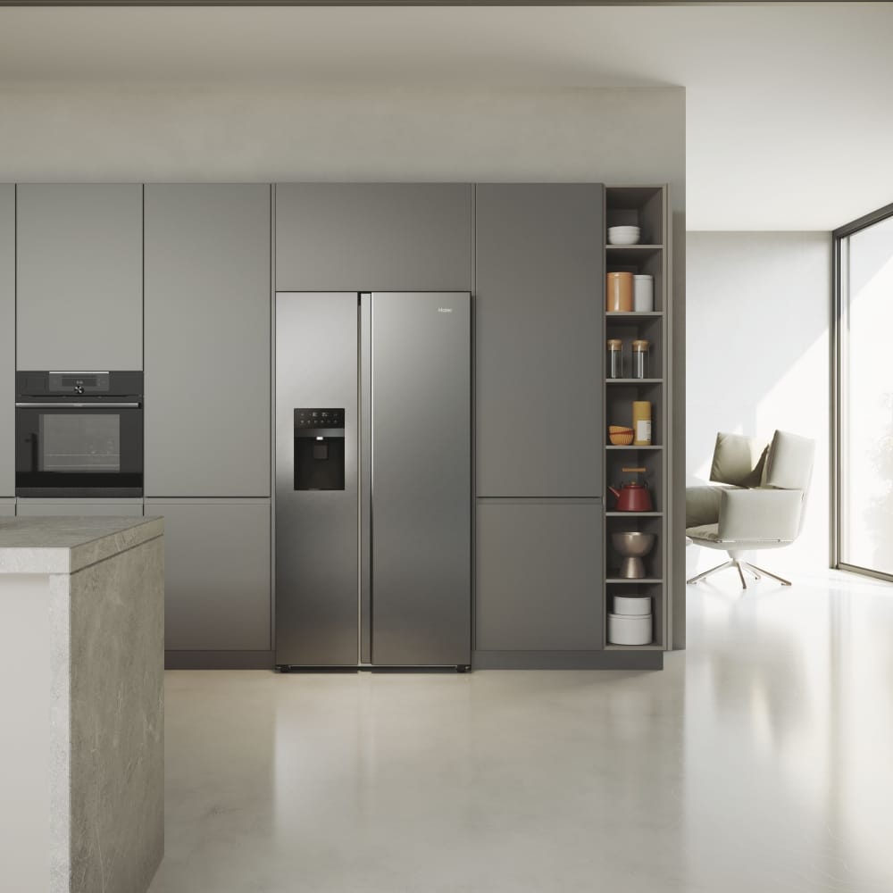 This American style fridge freezer from Haier will quickly become your new kitchen obsession! With a massive 511 litre capacity, this fridge freezer delivers on both space and style! Haier have pulled out all the stops with their Total No Frost technology, which prevents warm air entering your freezer. With the plumbed in water and ice dispenser, you’ll always have an ice cold drink to hand! Finished in platinum inox, this American fridge freezer from Haier is certain to be the centrepiece of any modern home.