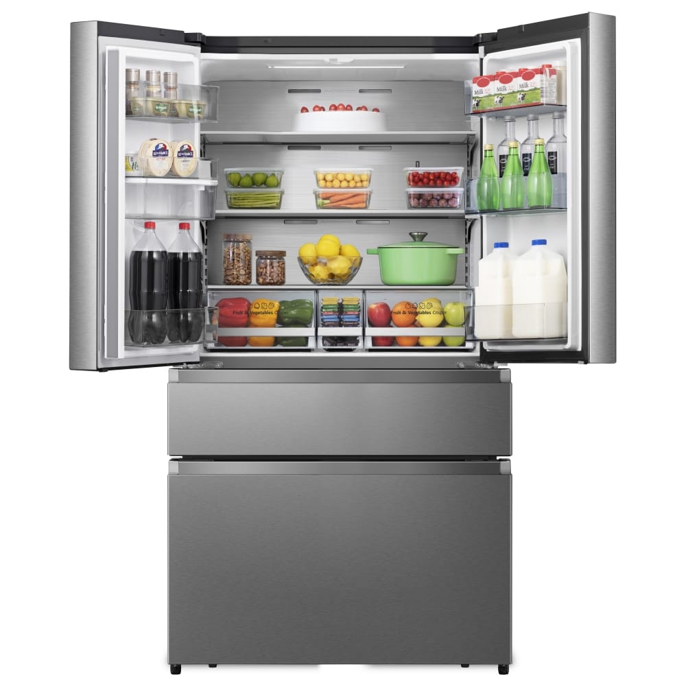If you’re looking for space and style, this Hisense French style fridge freezer is perfect for you. With a huge 579 litre capacity and tonnes of shelf space, this fridge freezer is ideal for a large family with lots of groceries! This model features a non-plumbed water dispenser and separate snack drawer, so it’s extra convenient when you’ve got lots of kids running around. It also has a 4 star freezer rating and is completely frost free! This fridge freezer has so many unique and handy features, but it also delivers on style. Hisense have pulled out all the stops with the stunning seamless double doors and convenient pull out drawers. Along with the sleek stainless steel effect finish, the gorgeous RF749N4WIF French style fridge freezer will be the everyday superhero of any kitchen!