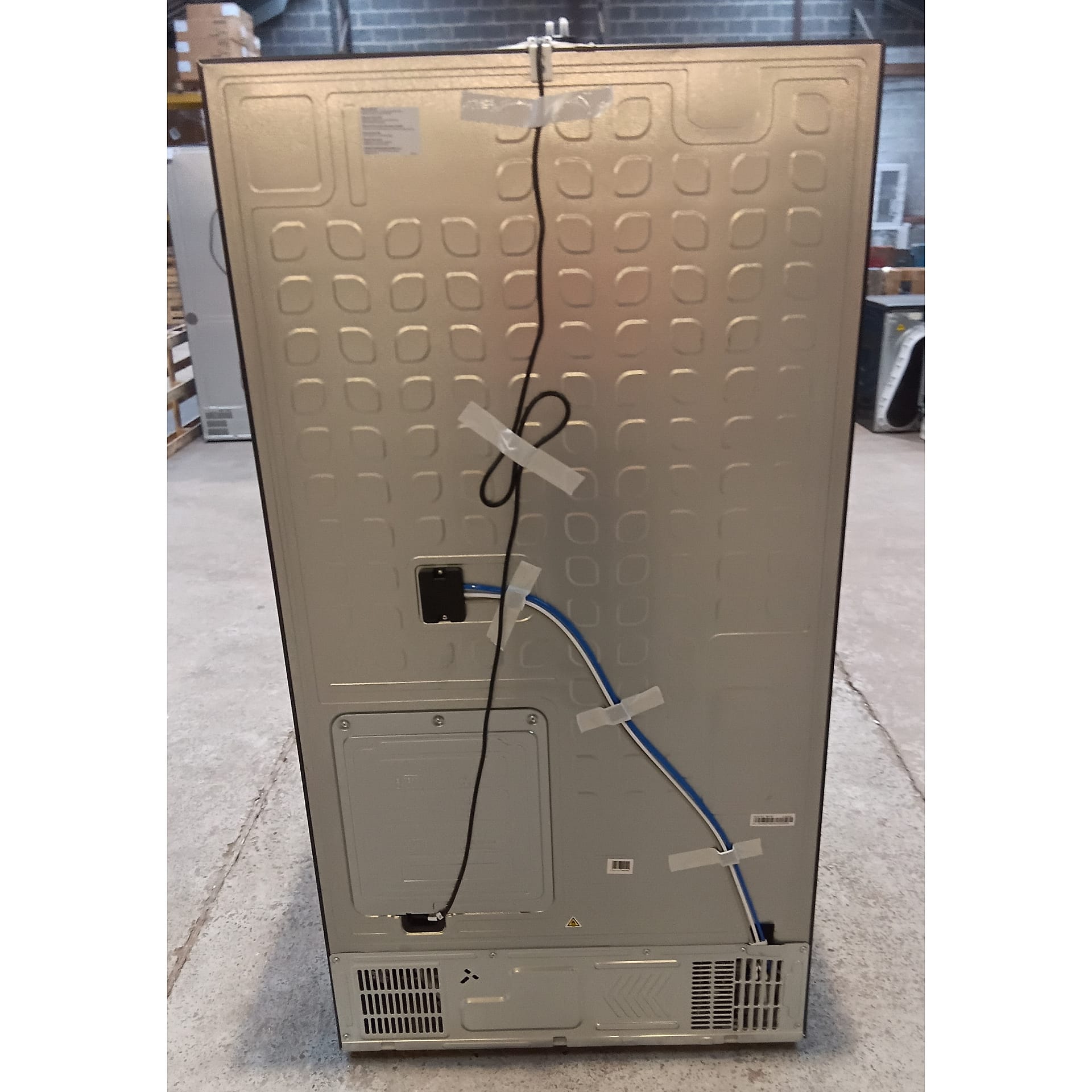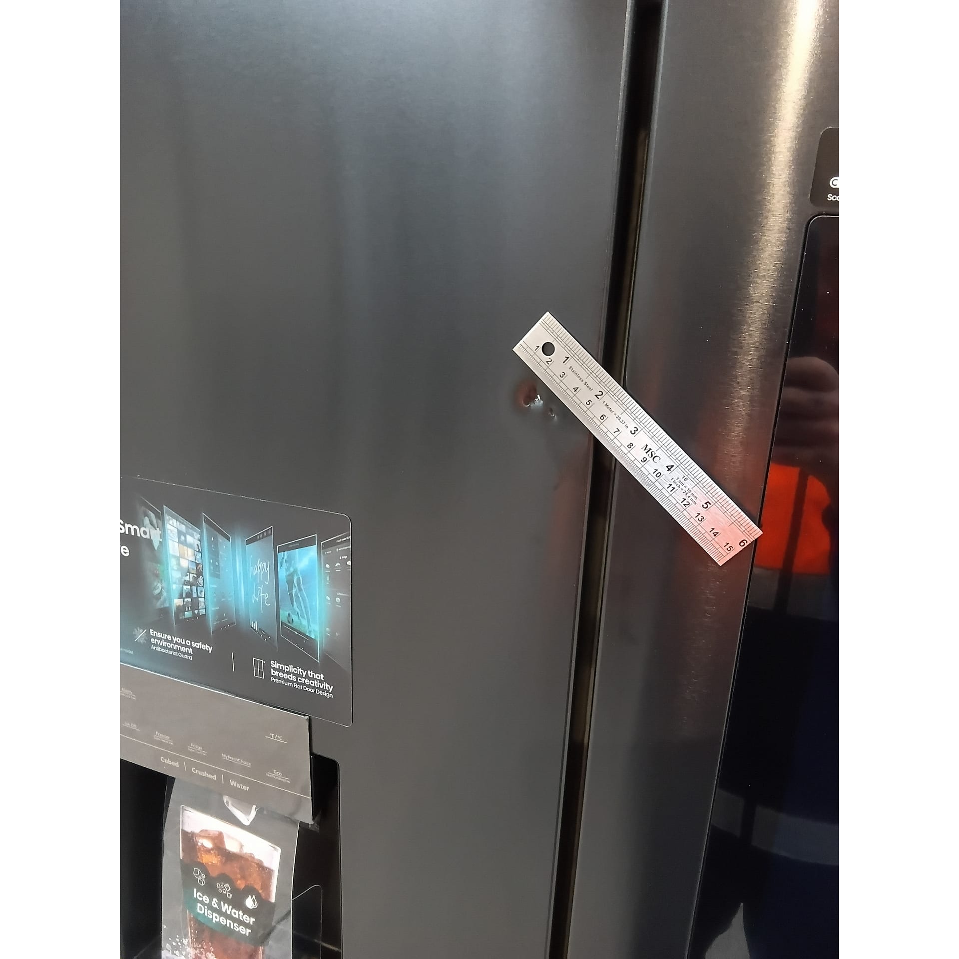 This product is damaged. It has a large dent on the left hand fridge door as shown in the images..
