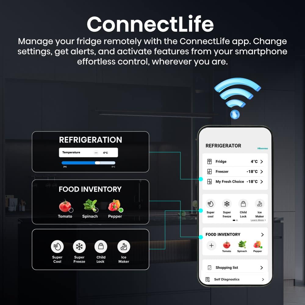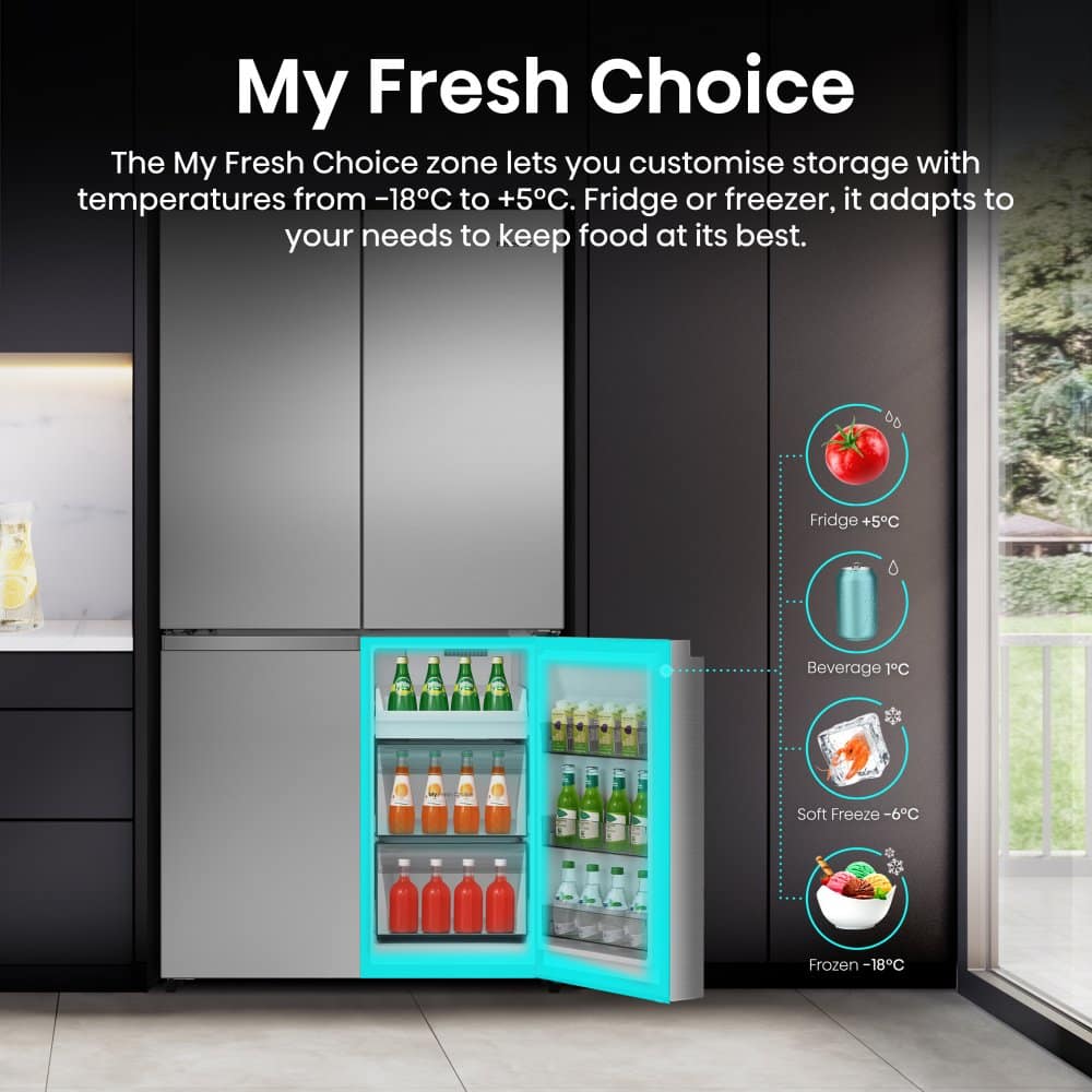This Hisense four door fridge freezer, with a huge total capacity of 647 litres, features a sleek stainless steel finish. Its iconic four door design offers three distinct temperature zones: fridge, freezer, and a versatile convertible zone. The My Fresh Choice zone can be easily converted from fridge to freezer, with settings ranging from -18°C to +5°C, providing flexible storage options. Furthermore, the Multi Air Flow System maintains an optimal temperature throughout, ensuring your food is perfectly chilled no matter where it’s placed. Innovative features like the Super Freeze and Super Cool functions help preserve the flavour, colour, and nutritional value of your fresh food, making this fridge freezer a stylish and practical addition to any kitchen.