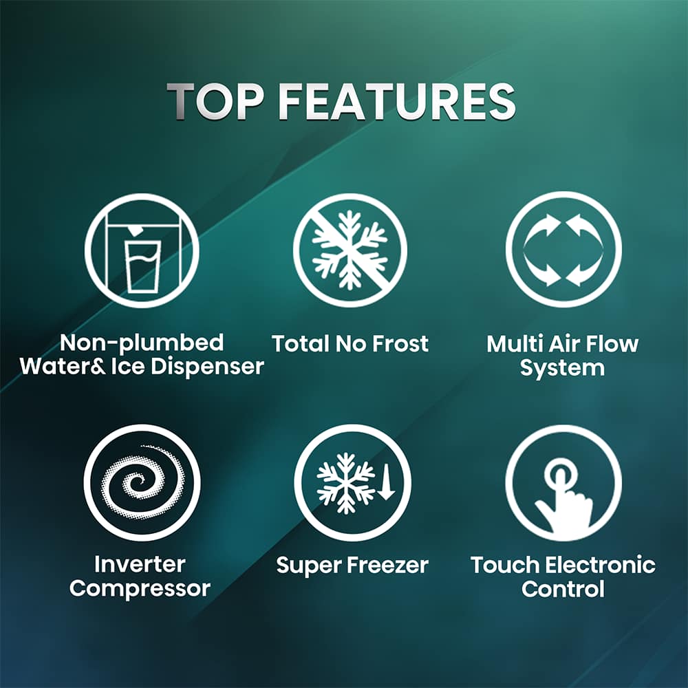 This Hisense American style fridge freezer, finished in black steel, offers a massive 566 litre capacity to meet all your weekly shopping needs. This appliance is full of fantastic features that make your life simpler whilst ensuring your food stays fresh. Enjoy the convenience of the non-plumbed chilled water dispenser and automatic ice maker and consistent cooling with the Multi-Air Flow System.