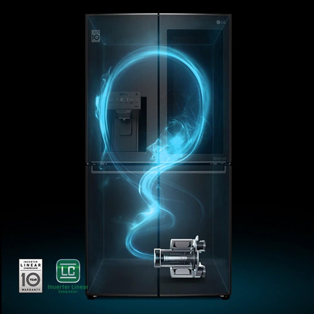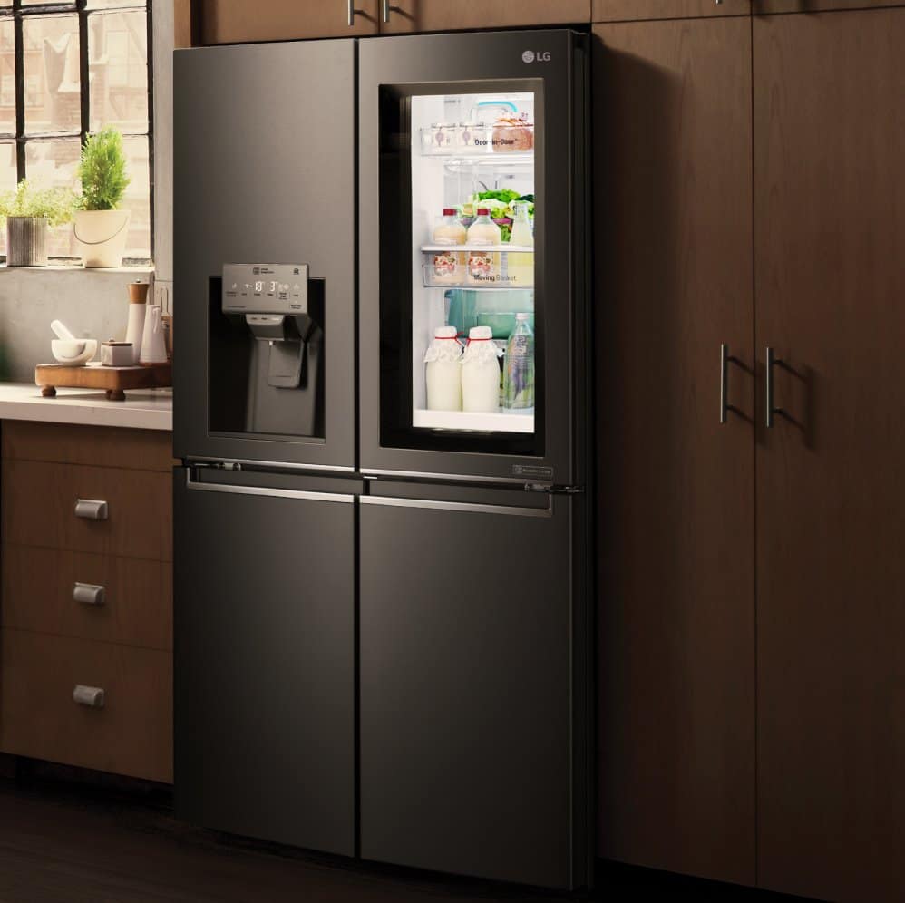 This stunning Instaview door-in-door French style fridge freezer from LG has a sleek mirrored glass panel that illuminates with two quick knocks on the glass. This allows you to see inside the easy access compartment without opening the door, reducing cold air loss to help keep food fresher for longer. With features like PureNFresh, which recirculates air through a dedicated fan, odourising the air for a pleasant smell from your fridge, folding shelves, a new and improved 2-step folding shelf which folds back to make room for all sorts of items and Smart ThinQ, which allows you to control and diagnose your refrigerator with your smartphone, this fridge freezer is the perfect companion for your family home. Finished in stunning black steel and with an A+ energy rating, this Instaview will look perfect in any modern kitchen.
