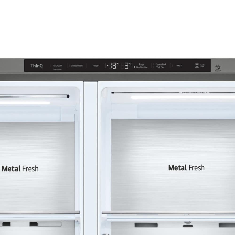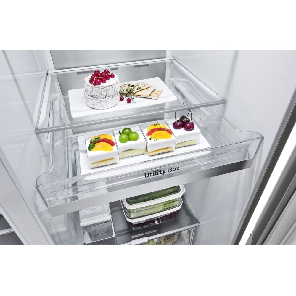 This LG American fridge freezer has a massive 635 litre storage capacity which will make the weekly grocery shop a thing of the past. This has the space for a monthly grocery shop! Special air vents throughout the fridge circulate cool air to maintain an even temperature, even when the door has been opened. The fridge and freezer are lit with LED lighting to ensure all the space is well illuminated. A non-plumbed ice and water dispenser means that you don’t have to worry about siting this fridge freezer near a water outlet. With a gorgeous Metal Sorbet silver finish and touch screen LED display, it’s no wonder we love this fridge freezer so much.