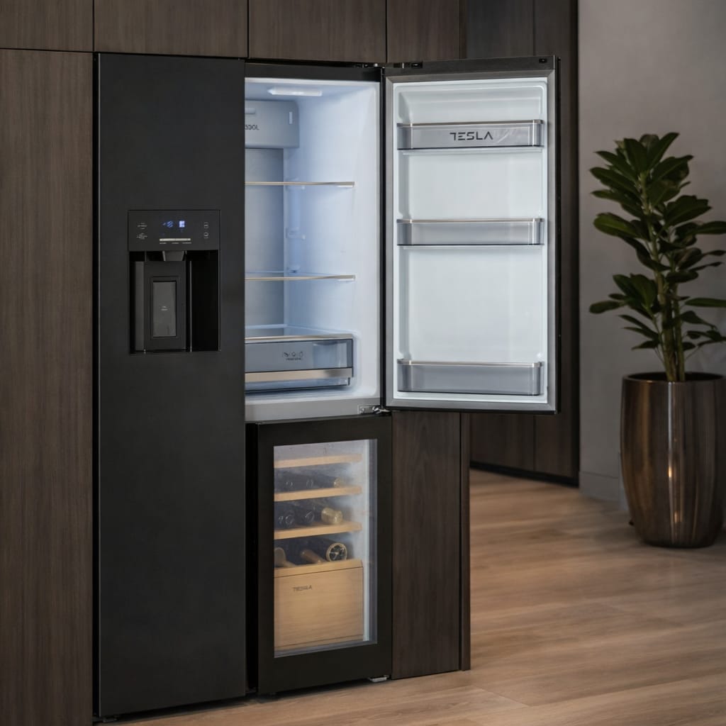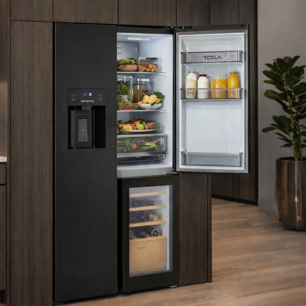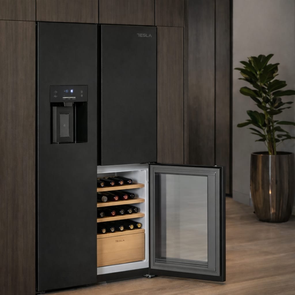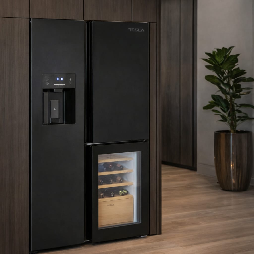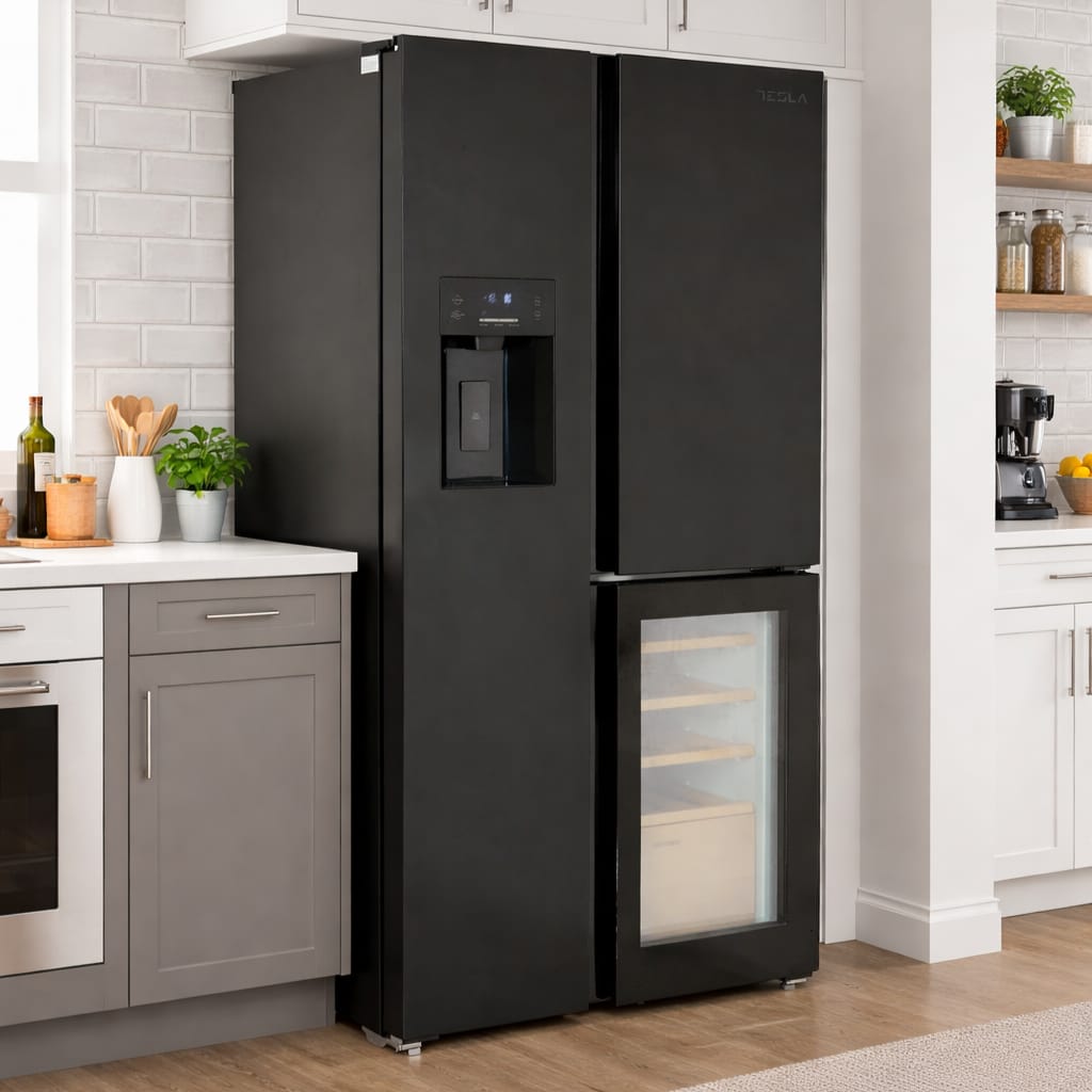 Tesla T530TDBG American Fridge Freezer With Wine Cooler, Water & Ice – BLACK