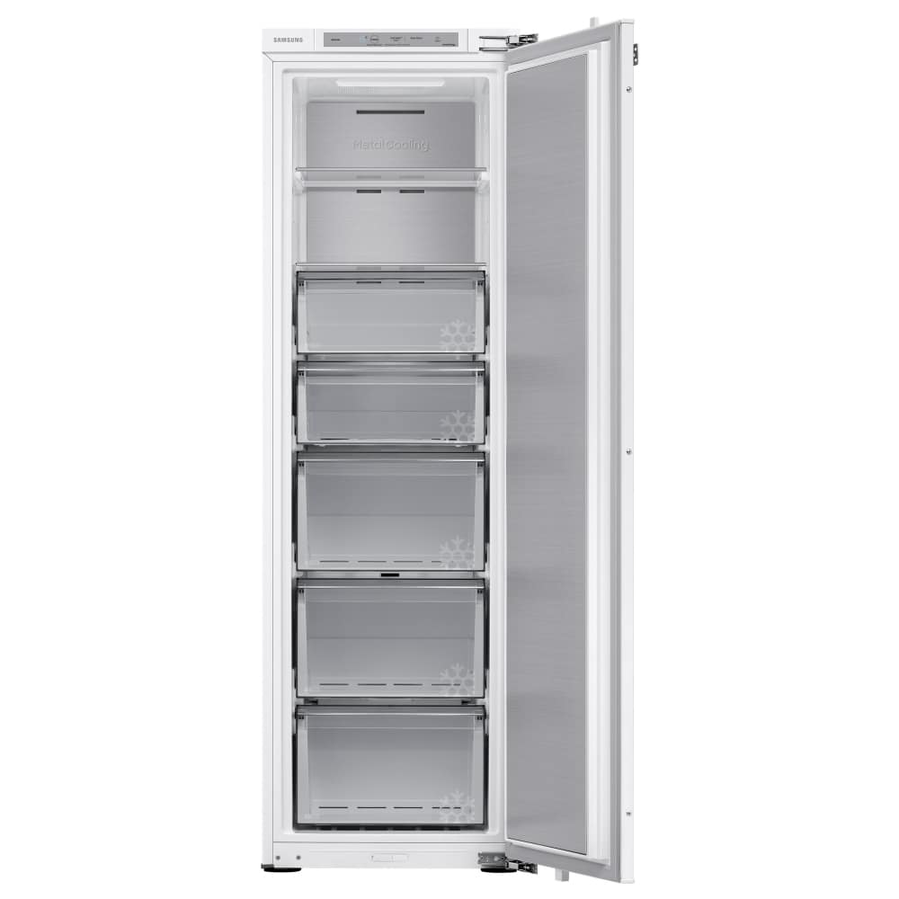 Your frozen goods will certainly be in safe hands with the BRZ22720EWW integrated freezer by Samsung. Standing at 178cm tall, this freezer offers an impressive 218 litres of space. Featuring 5 transparent drawers and 2 glass shelves, this freezer uses All-Around cooling to ensure every item is chilled to perfection no matter where it is placed. SpaceMax technology means thinner walls and more space inside without compromising on performance. With Total No Frost, spending hours defrosting will become a thing of the past. Temperature is evenly maintained to prevent ice build-up, resulting in easy access and a clear view of your favourite frozen goods. Wi-Fi embedded and compatible with the SmartThings app, you can monitor and manage the performance of your freezer anywhere, anytime. Change settings and monitor its energy consumption and even get alerts if the door is left open. Fitted with a Digital Inverter Motor for long-lasting performance and environmental protection, this integrated freezer is ready to serve you and your family for years to come.