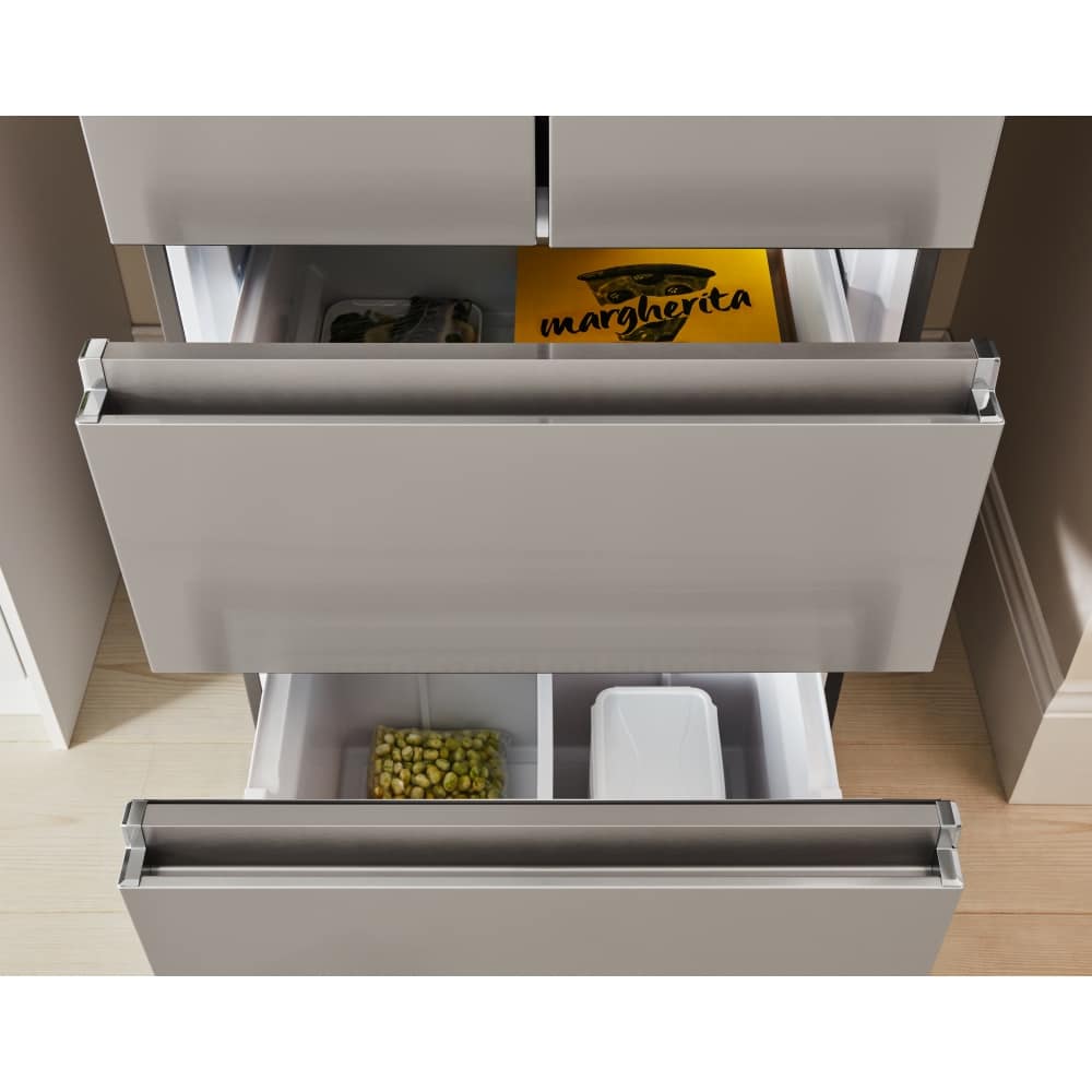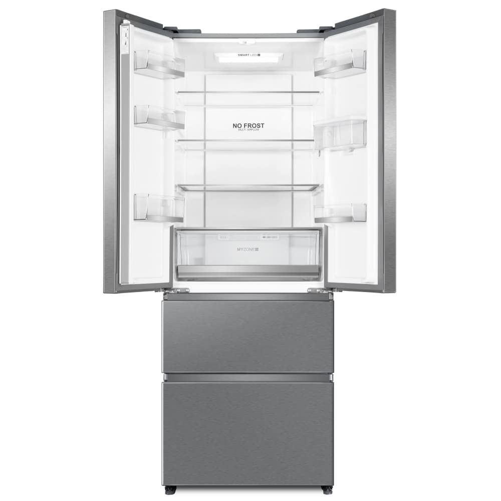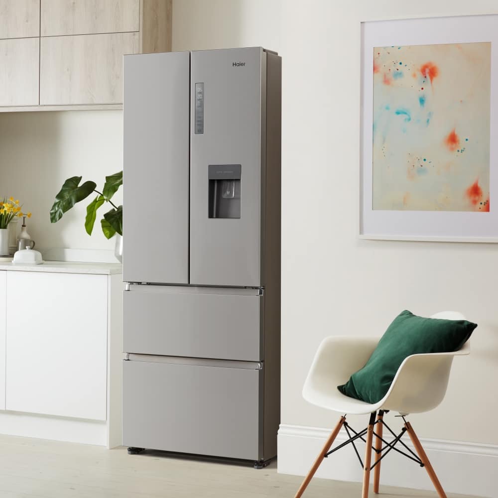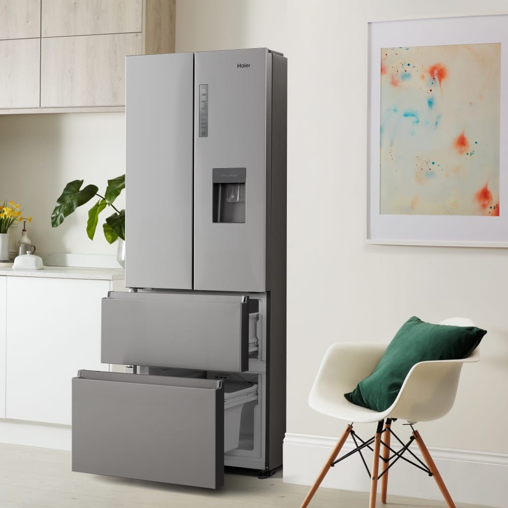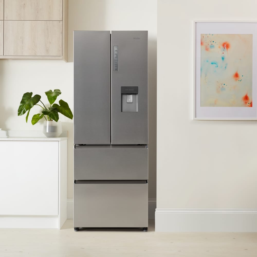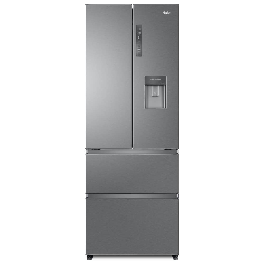 This Haier frost free fridge freezer will quickly become your new kitchen obsession! Standing at 70cm wide, with an impressive 444 litre capacity, this fridge freezer certainly delivers on both space and style! This model features a special MyZone, in which the temperature can be changed at any moment according to your needs. Go from -6°C to +5°C with the click of a button! It also features a unique HumidityZone; a drawer that prevents condensation and seals in the nutritional value of your food. Haier have pulled out all the stops with their Total No Frost technology, which prevents warm air entering your freezer. No more painful manual defrosting! With a non-plumbed water dispenser and F Class energy rating, this fridge freezer from Haier is sure to be the focal point of any modern kitchen.