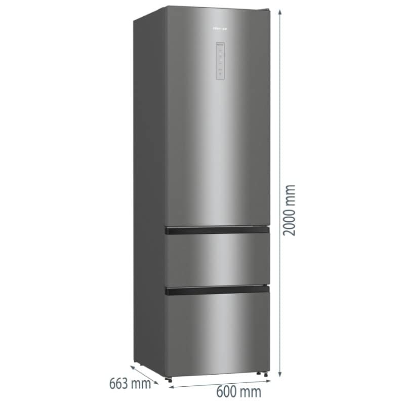 Standing at a towering 200cm, this 60cm wide Hisense Fridge Freezer offers an impressive 368 litre total capacity, perfect for accommodating all your groceries. Its stainless steel finish complements any kitchen design. The frost free feature eliminates the need for manual defrosting, saving you time and effort. Innovative storage options include a Chill Zone drawer, and a Fast Freeze function to rapidly lock in the freshness of your food. LED interior lighting provides clear visibility, making it easy to find items at any time. This fridge freezer is designed to keep your food in optimal conditions, combining style, convenience, and advanced technology for any modern kitchen.