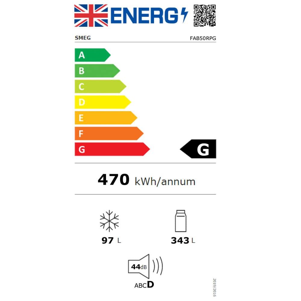 The superb pastel green FAB50 retro fridge freezer from Smeg is 80cm wide and 187cm tall. It boasts an impressive total net capacity of 440 litres. The frost free freezer features a handy twist ice maker and in door storage pockets for smaller items. This model has right hinged doors.