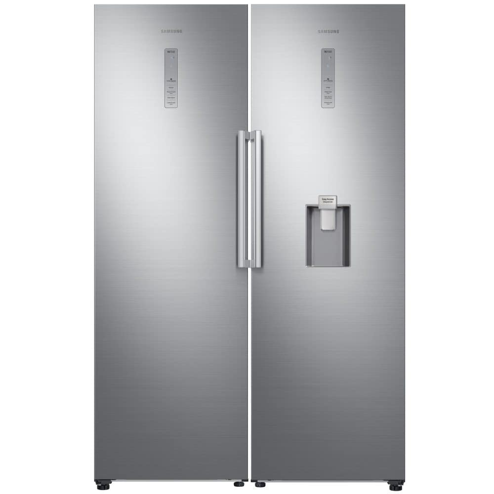 This 185cm high freestanding larder fridge and frost free freezer pack from Samsung is finished in refined steel. The fridge offers an impressive 382 litres of net capacity and a water dispenser, whilst the freezer has a 323 litre capacity and a slim ice dispenser.