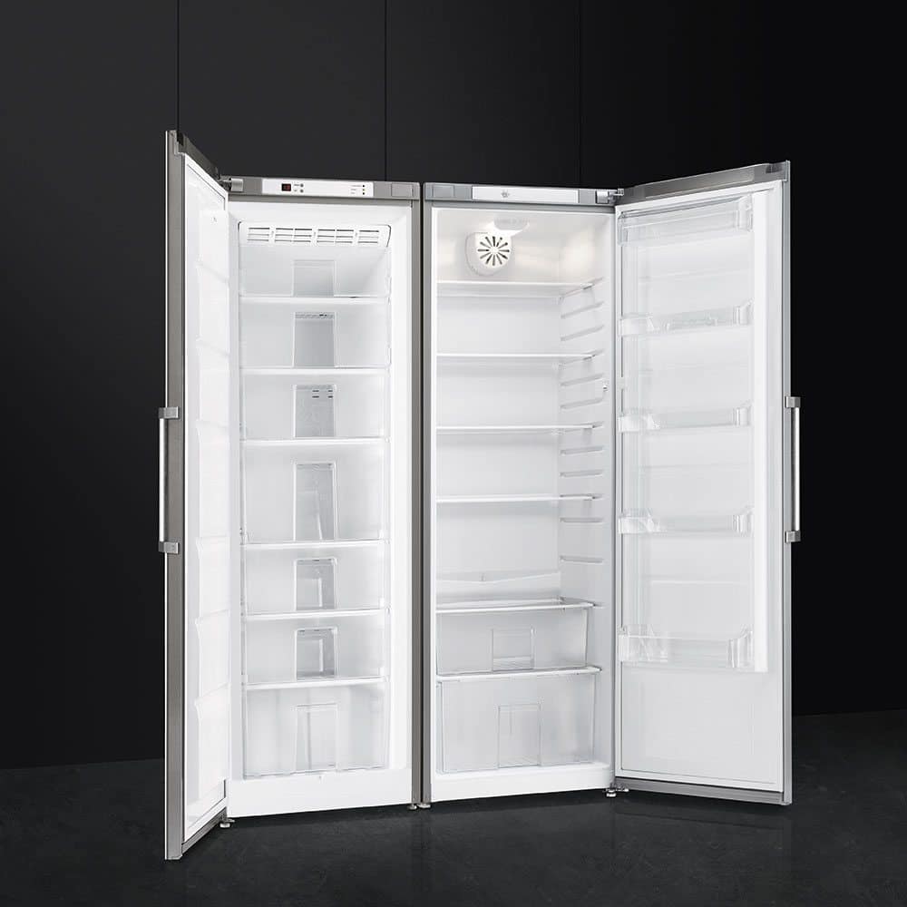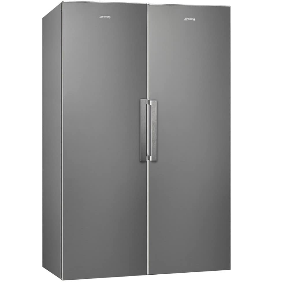 This 187cm high larder fridge and frost free freezer package from Smeg is finished in stainless steel. The fridge section offers an impressive 349 litres of net capacity whilst the freezer offers 251 litres, and both units link together with a joining strip to give a seamless appearance. Both appliances have an A+ energy rating so you can rest assured that energy usage will be kept to a minimum.