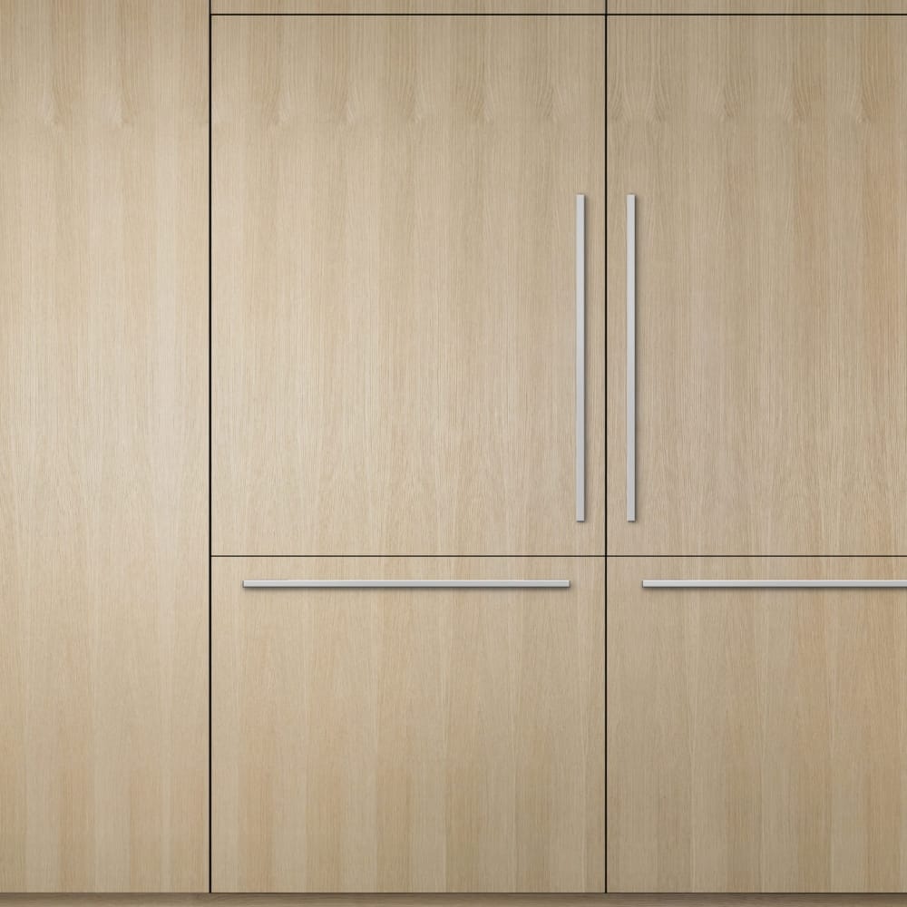 You can either fit custom made panels to coordinate with your kitchen design or purchase the Fisher & Paykel door panel and handles sets: