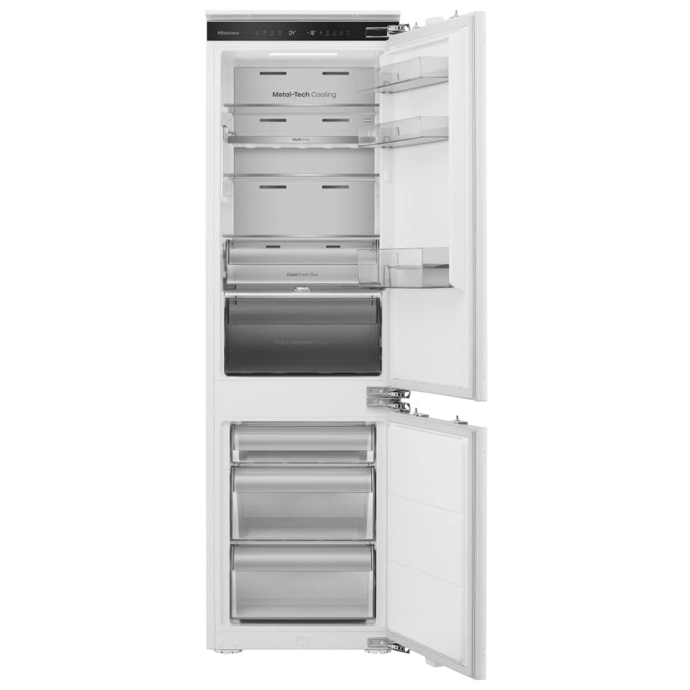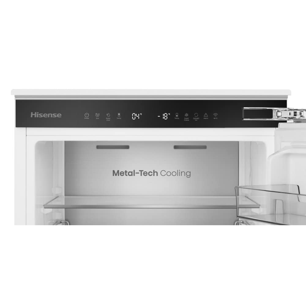 We are pleased to present this superb integrated fridge freezer by Hisense. Offering everything you need to preserve your food, the RB3B250SAWE goes the extra mile thanks to its Wi-Fi connectivity and NoFrost function. Metal cooling influences the even distribution of cool air, ensuring your food stays fresh for longer. Adjust and control temperature and explore its other functions with the easy-to-control, LED touch display and compatibility with the ConnectLife app. The fridge section has a net capacity of 176 litres and features a range of adjustable glass shelves and drawers for your salad ingredients and other fresh food. In the slightly smaller, 76 litre capacity freezer section, enjoy frost free freezing that preserves the lifetime of your frozen goods. Make the most out of three freezer drawers and of course, a handy ice cube tray! Lit with LED strips and featuring a high temperature door alarm for extra peace of mind, give your food the home it deserves with this fantastic integrated fridge freezer by Hisense.