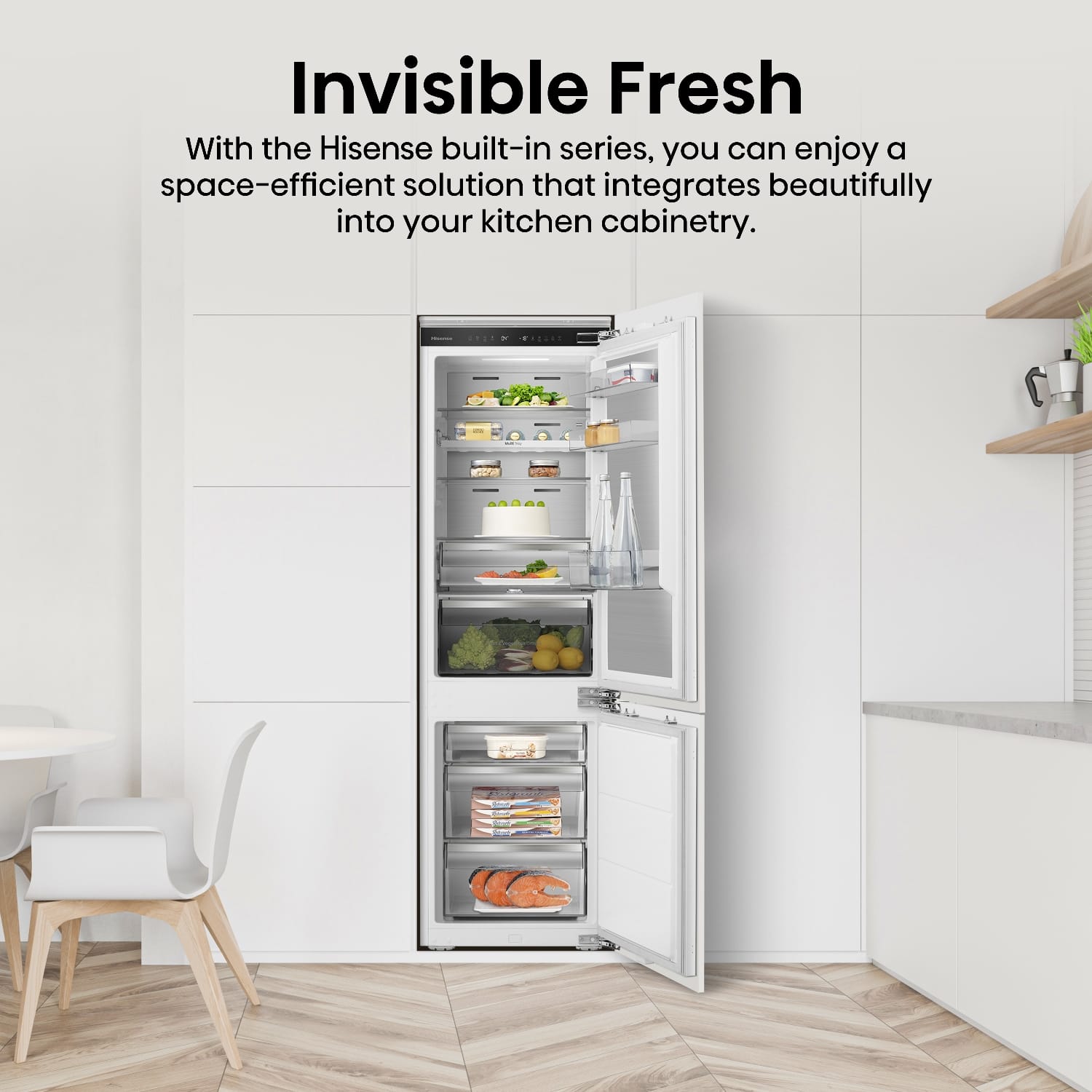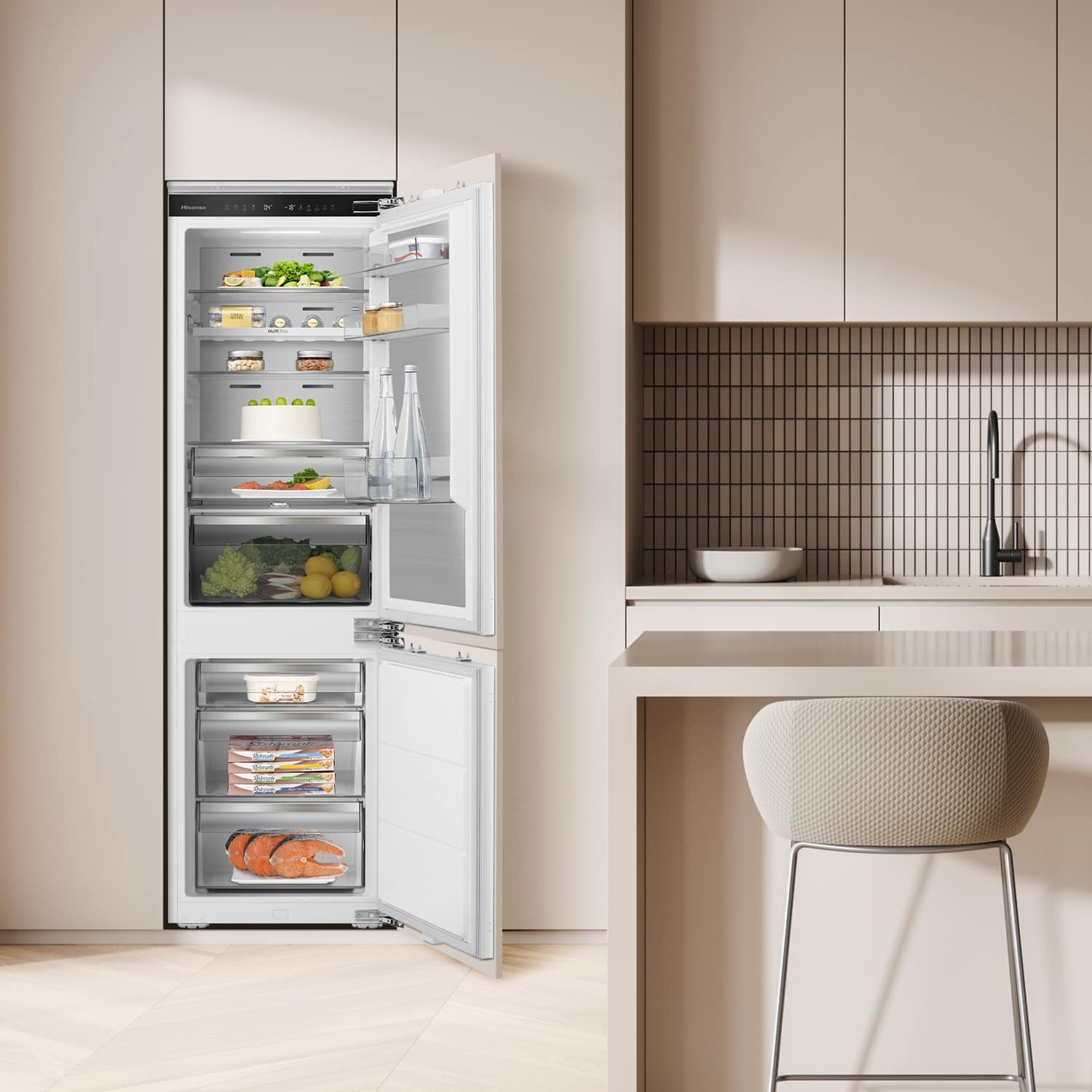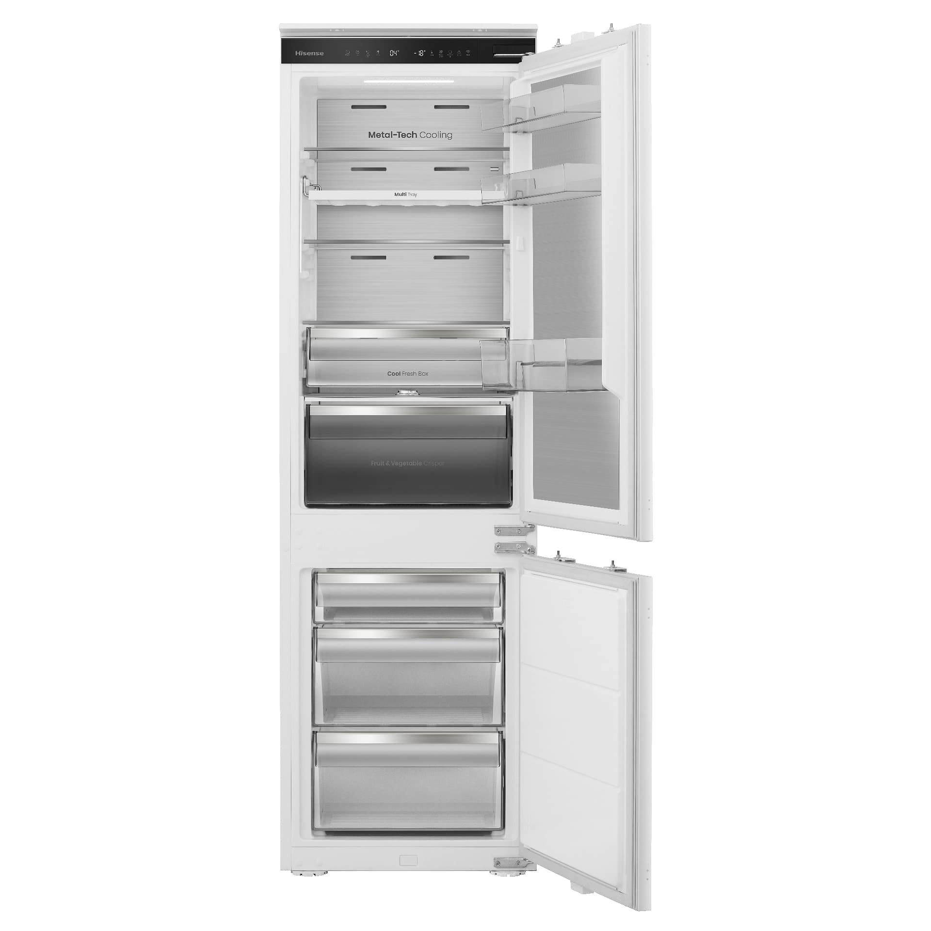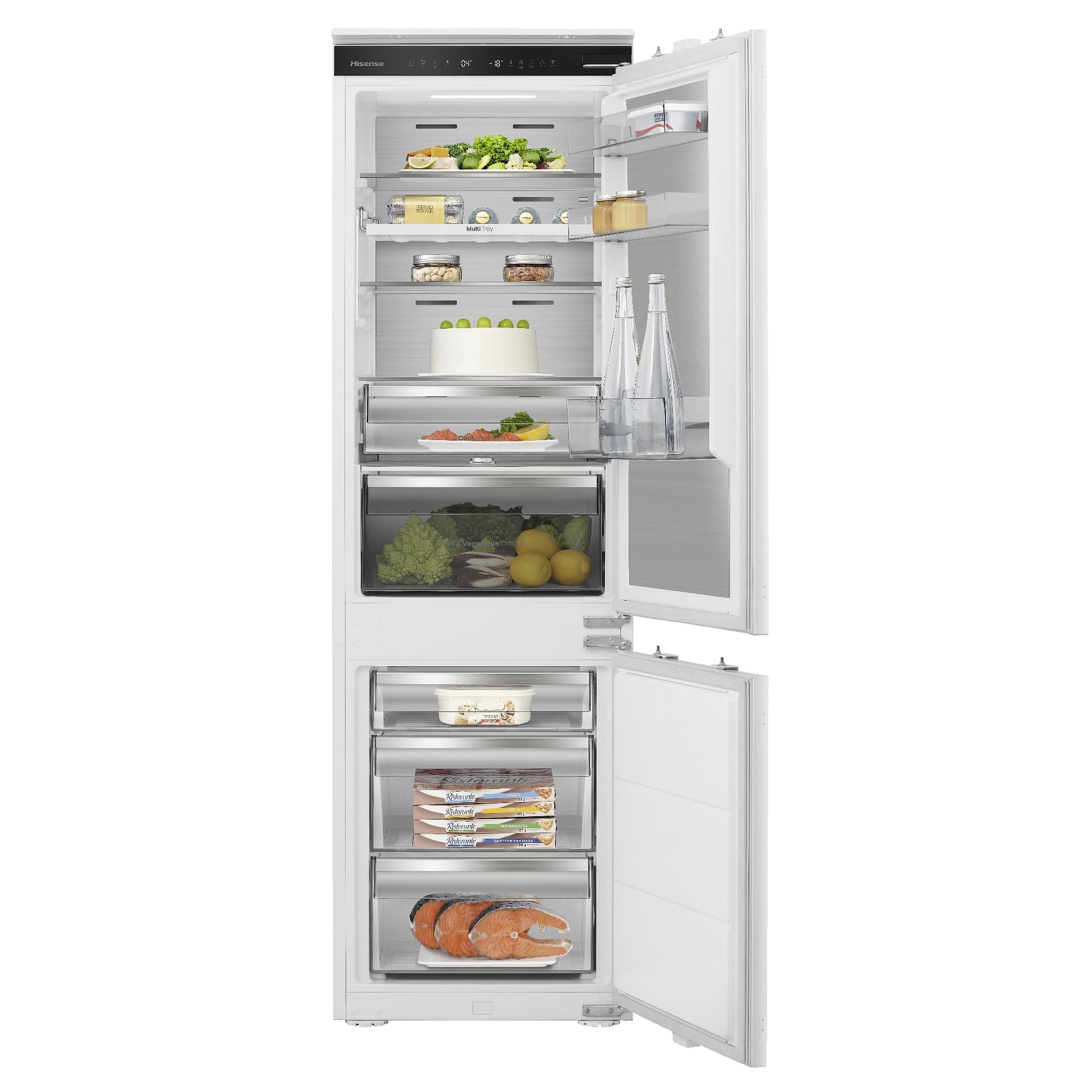 This Hisense integrated fridge freezer goes the extra mile thanks to its Wi-Fi connectivity and NoFrost function. Metal cooling influences the even distribution of cool air, ensuring your food stays fresh for longer. Adjust and control temperature and explore its other functions with the easy-to-control, LED touch display. The fridge section features a range of adjustable glass shelves and drawers for your salad ingredients and other fresh food. In the freezer section, make the most out of three freezer drawers. This model also features LED interior lighting and an open door alarm.