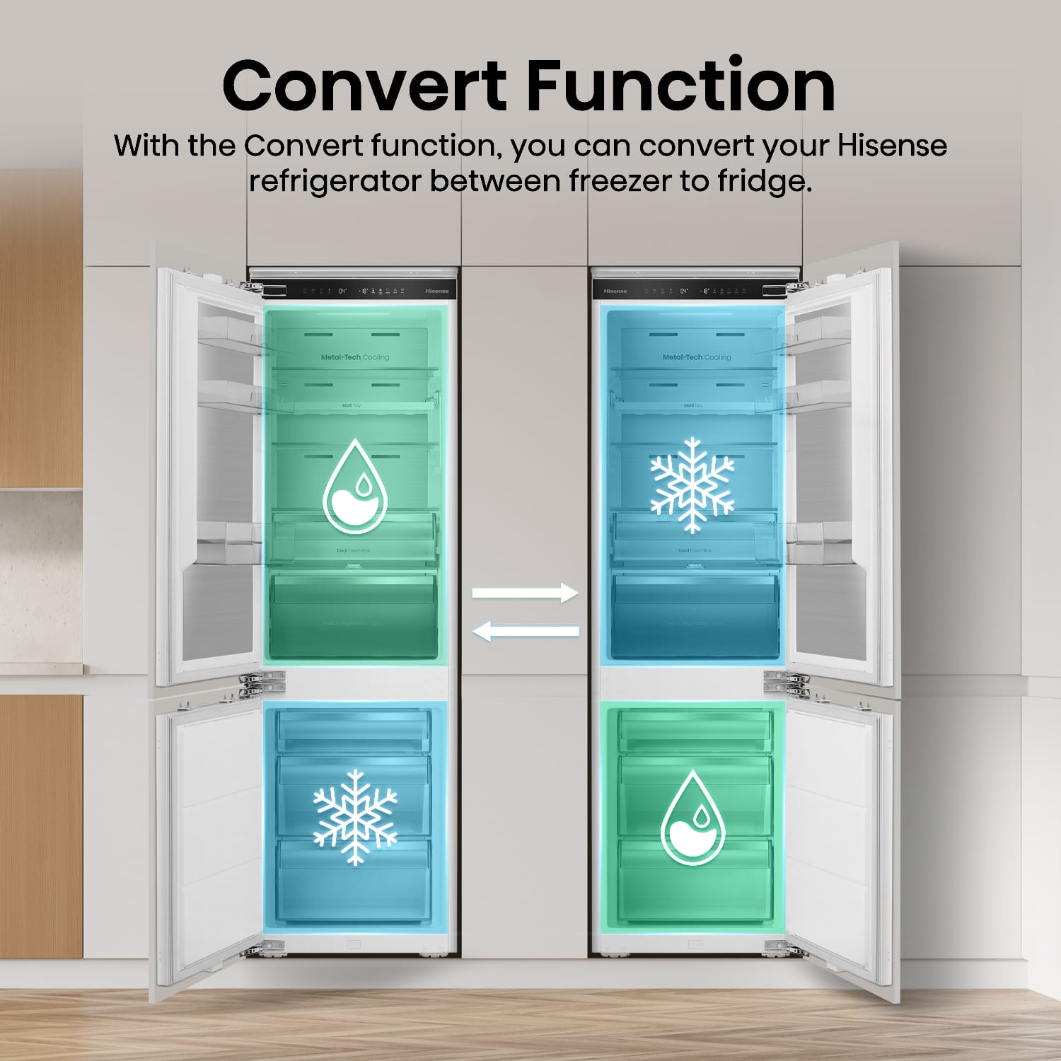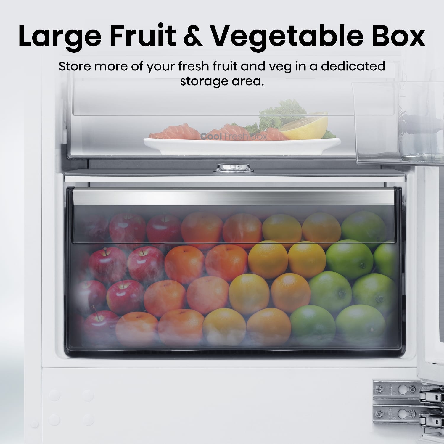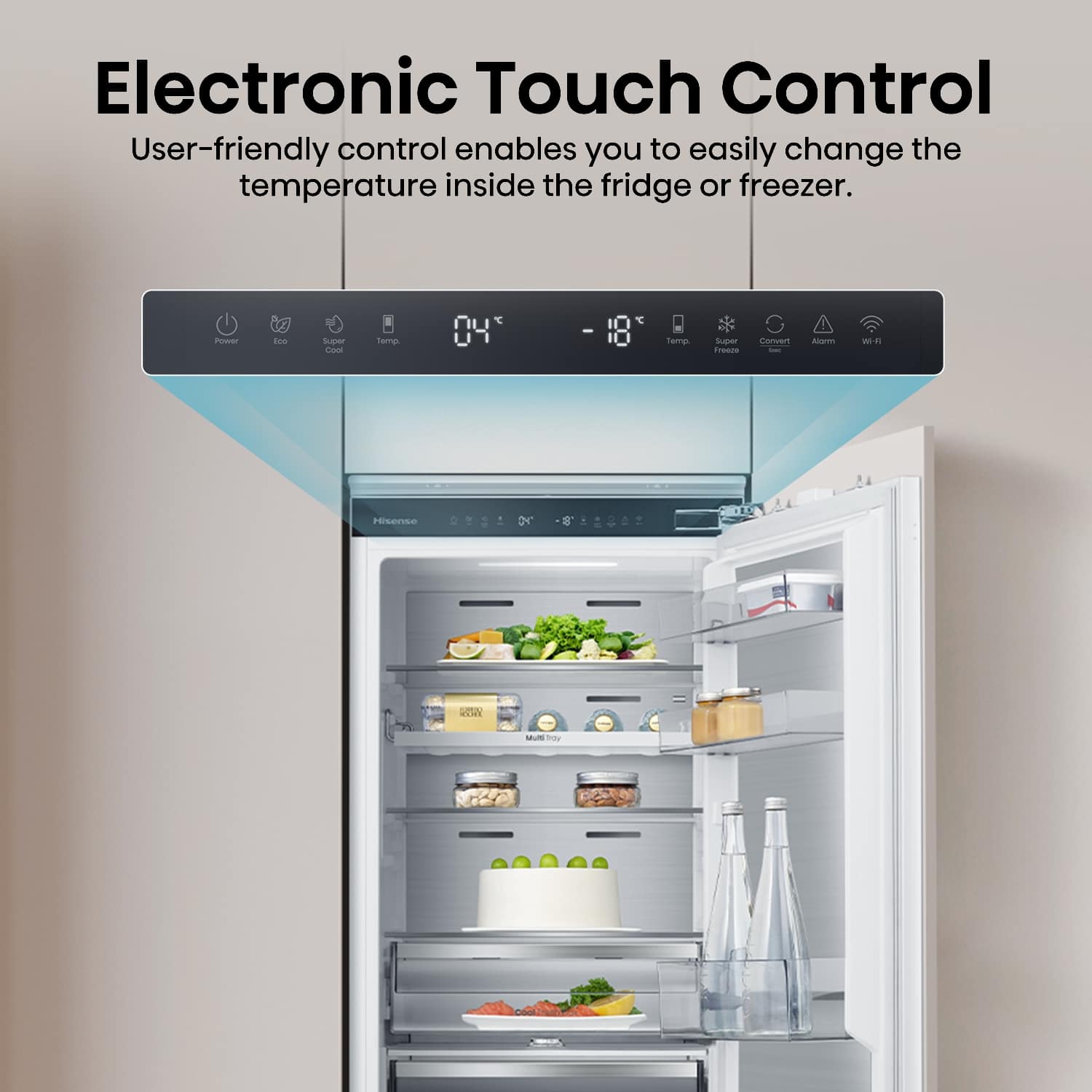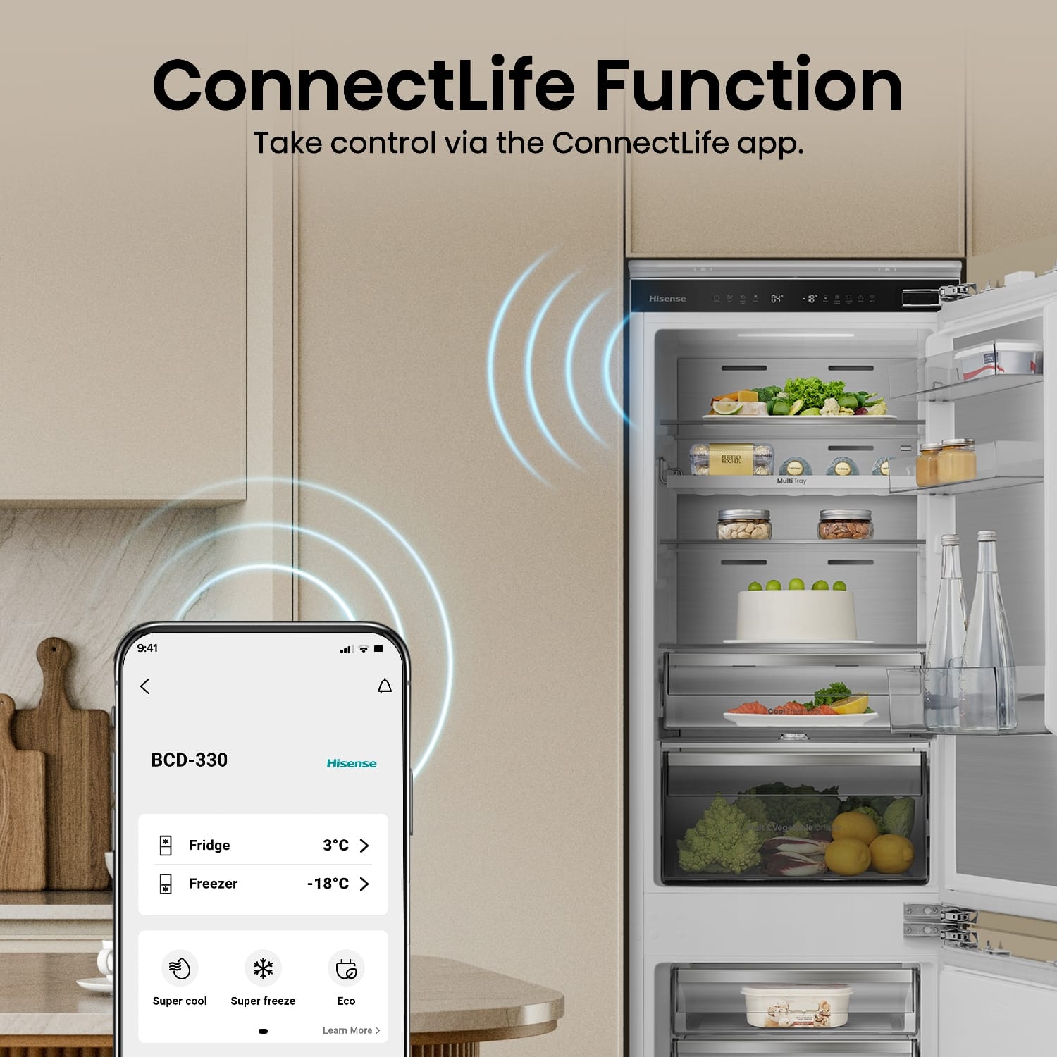 This Hisense integrated fridge freezer goes the extra mile thanks to its Wi-Fi connectivity and NoFrost function. Metal cooling influences the even distribution of cool air, ensuring your food stays fresh for longer. Adjust and control temperature and explore its other functions with the easy-to-control, LED touch display. The fridge section features a range of adjustable glass shelves and drawers for your salad ingredients and other fresh food. In the freezer section, make the most out of three freezer drawers. This model also features LED interior lighting and an open door alarm.