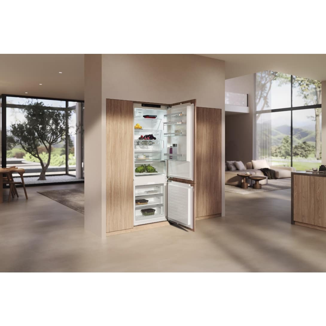 This superb 71cm wide integrated fridge freezer from Miele will fit perfectly into a modern kitchen, thanks to its installation behind furniture doors, for that streamlined look. Even hidden away it offers superb cooling, with its Dynamic Cooling system distributing cool air to every corner, whilst the frost free freezer minimises ice formation for easy maintenance. Boasting a spacious 382 litre capacity, this model is a handy addition to a busy kitchen.