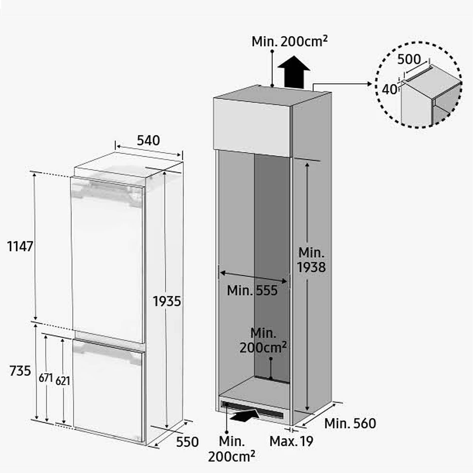 Designed to be fitted into a tall housing unit behind your own furniture doors, this Samsung integrated fridge freezer offers a net capacity of 267 litres across adjustable glass shelves and drawers. All-Around cooling continuously moves cool air around the interior of your fridge freezer, keeping everything cooled to perfection no matter where it is placed. With the help of Total No Frost, ice build up is eliminated through the extraction of air and humidity. This maintains an even temperature, meaning you’ll never have to manually defrost your freezer again. This model also has connectivity with the Samsung SmartThings app.