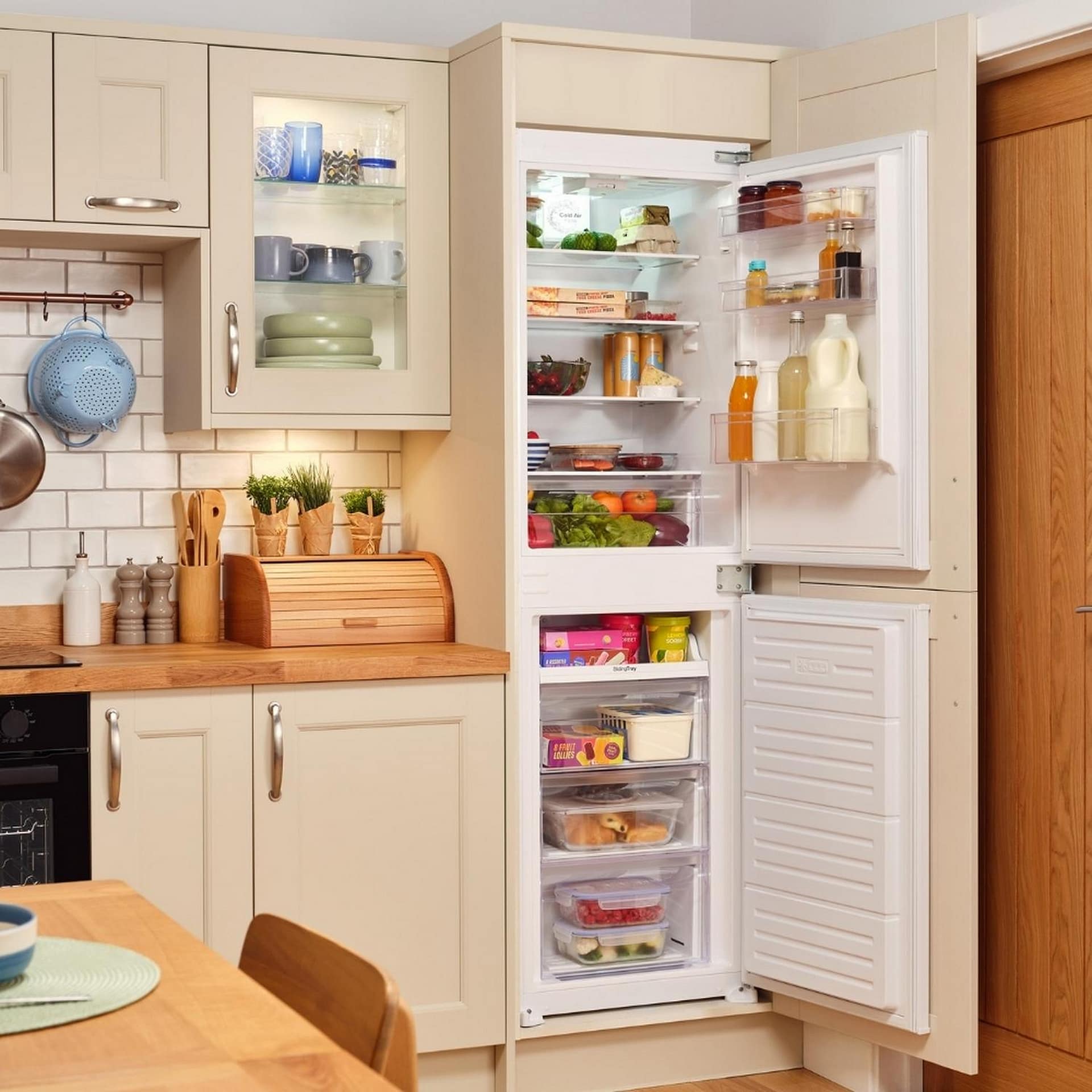 Offering plenty of space, this 50/50 split integrated fridge freezer is ideal for busy kitchens. It combines functionality with a modern design, providing ample storage for both fresh produce and frozen items without compromising on style. Its seamless integrated design allows it to fit effortlessly into your cabinetry, keeping your kitchen looking neat and sophisticated.