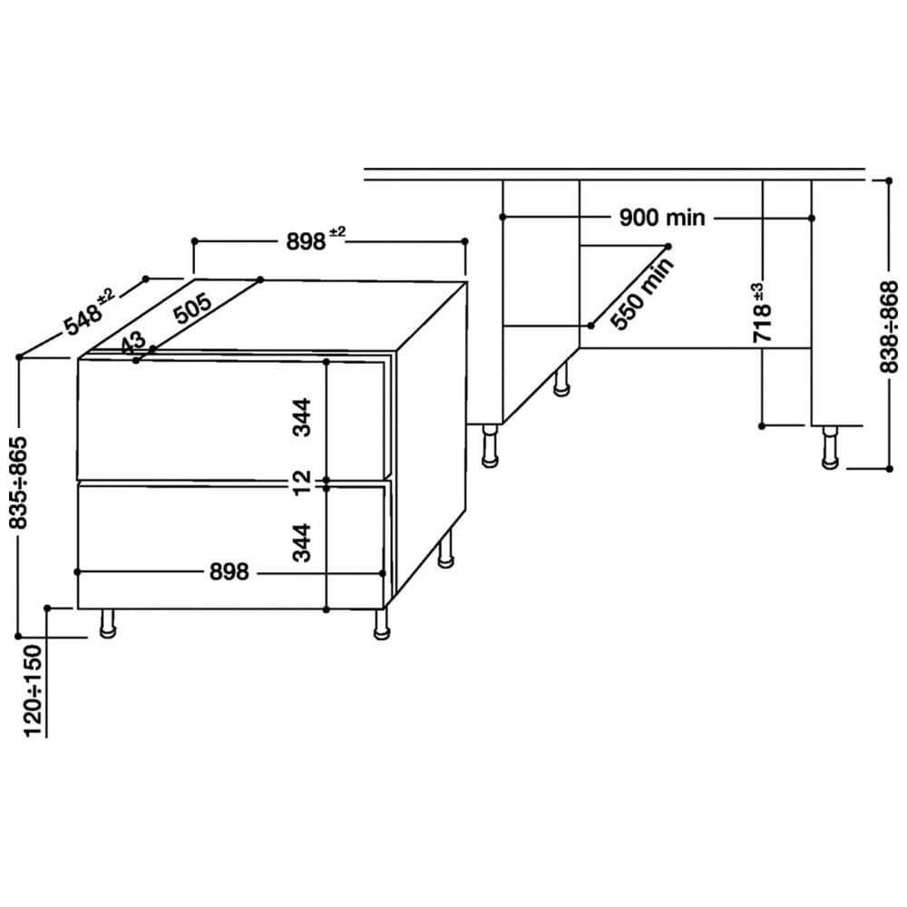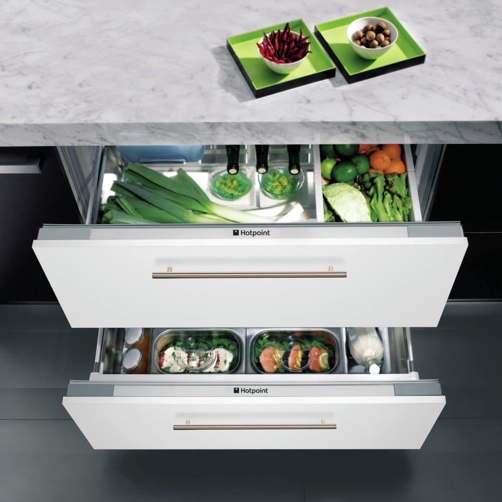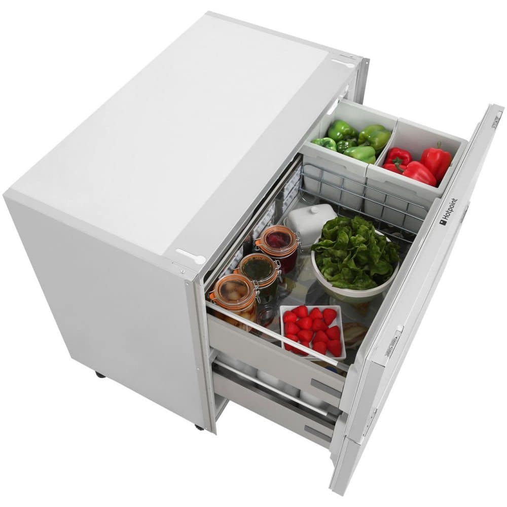 This integrated built under fridge from Hotpoint is designed to be fitted under your worktop with furniture panels on the front to match the rest of your kitchen. This model offers 2 individual 90cm wide drawers and has an impressive 150 litre net capacity. Its ergonomic design gives easy access to contents and includes antibacterial protection. It has an A+ energy rating and as such is a highly efficient appliance.