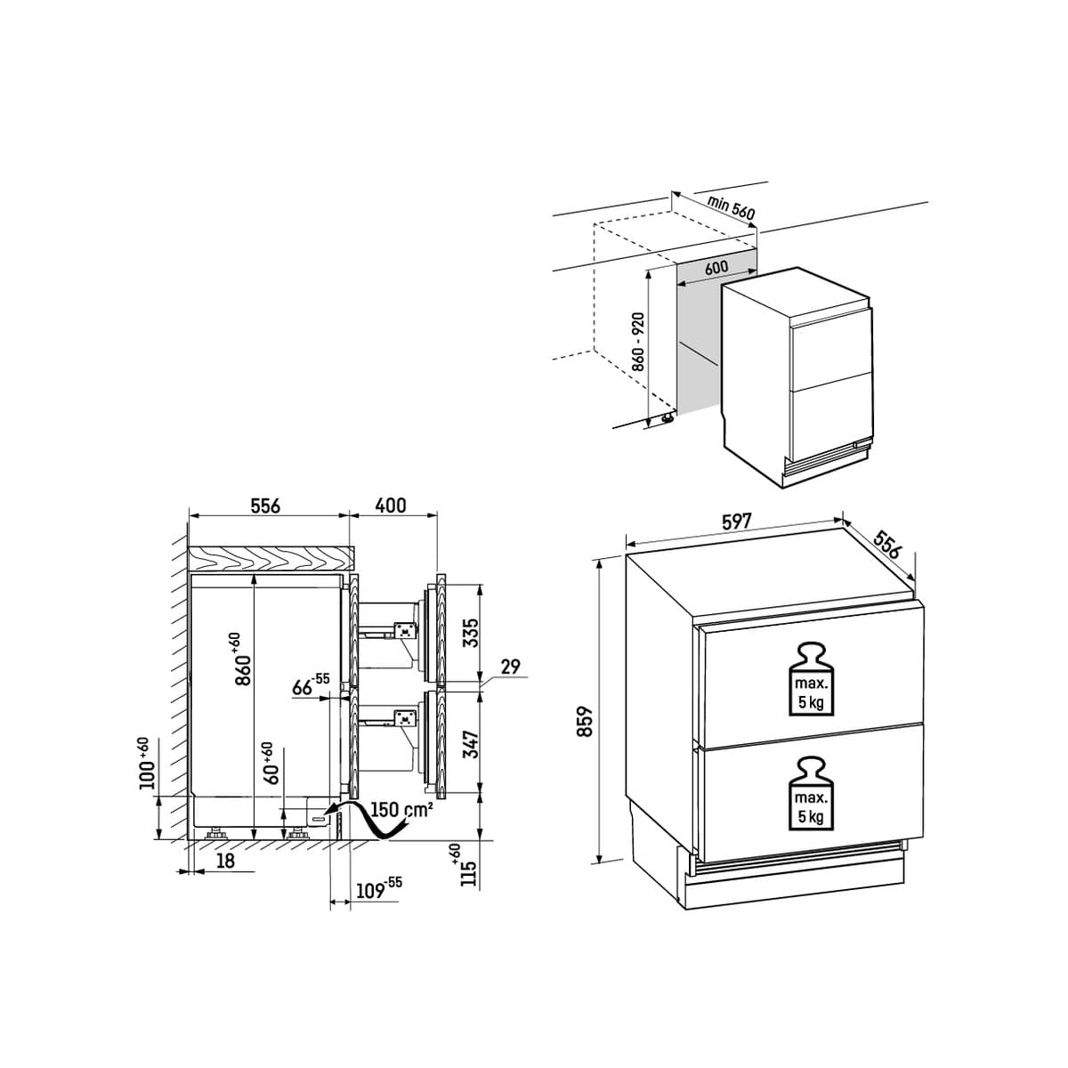 Aperture dimensions: h860-920 x w600 x d560mm