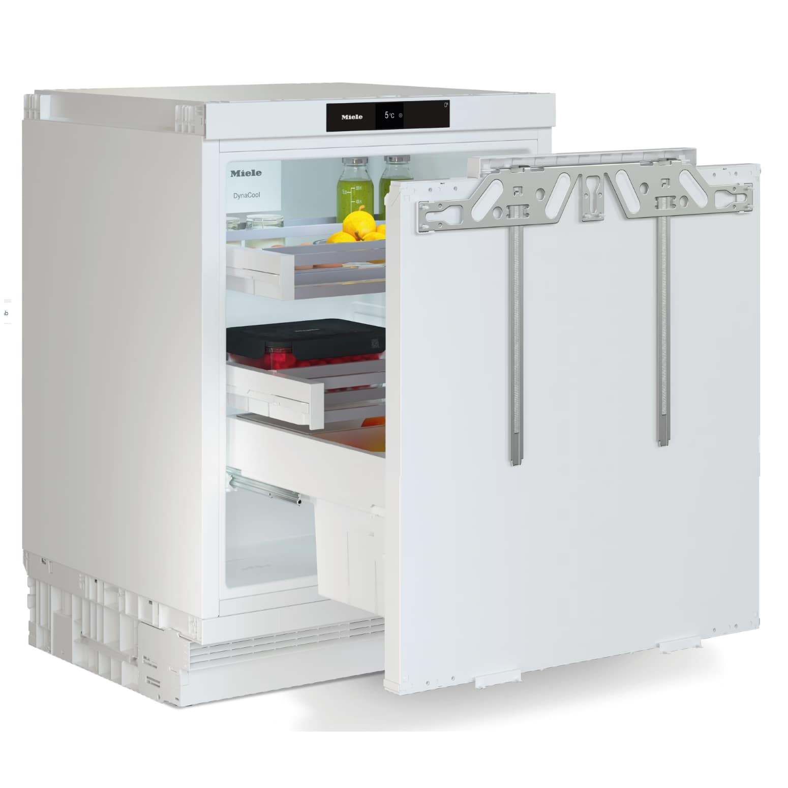 This product has pull-out door-on-door fittings without hinges. The furniture panel is fixed to the front of the appliance.