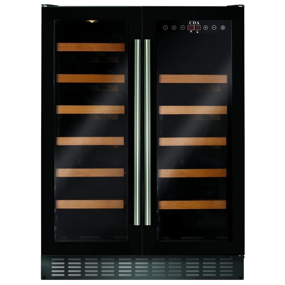 This superb freestanding undercounter dual zone wine cooler from CDA has a capacity of 40 wine bottles and an adjustable temperature range. It has black doors with smoked glass windows.