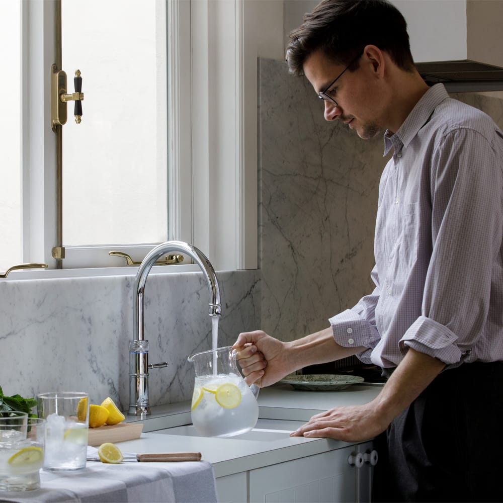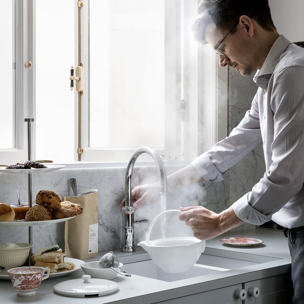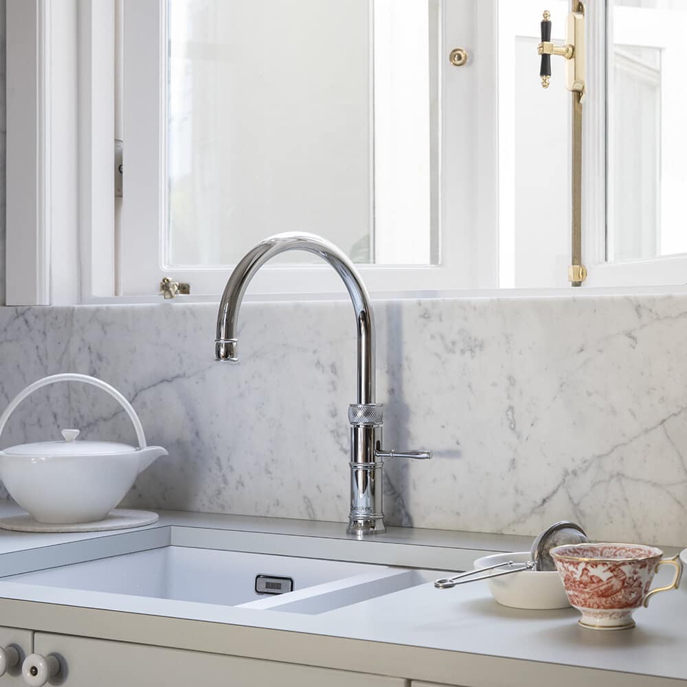 Unlike most European countries, we tend to pipe our kitchen’s hot water supply all the way from our main boiler, which can mean running the tap for some time before the hot water comes through, wasting time and energy. The Quooker Combi Classic Fusion delivers instant boiling water, cold water and hot water, produced by mixing boiling water from the Quooker tank with cold water, all from a single tap. This is the round model, finished in chrome with a seven litre tank.