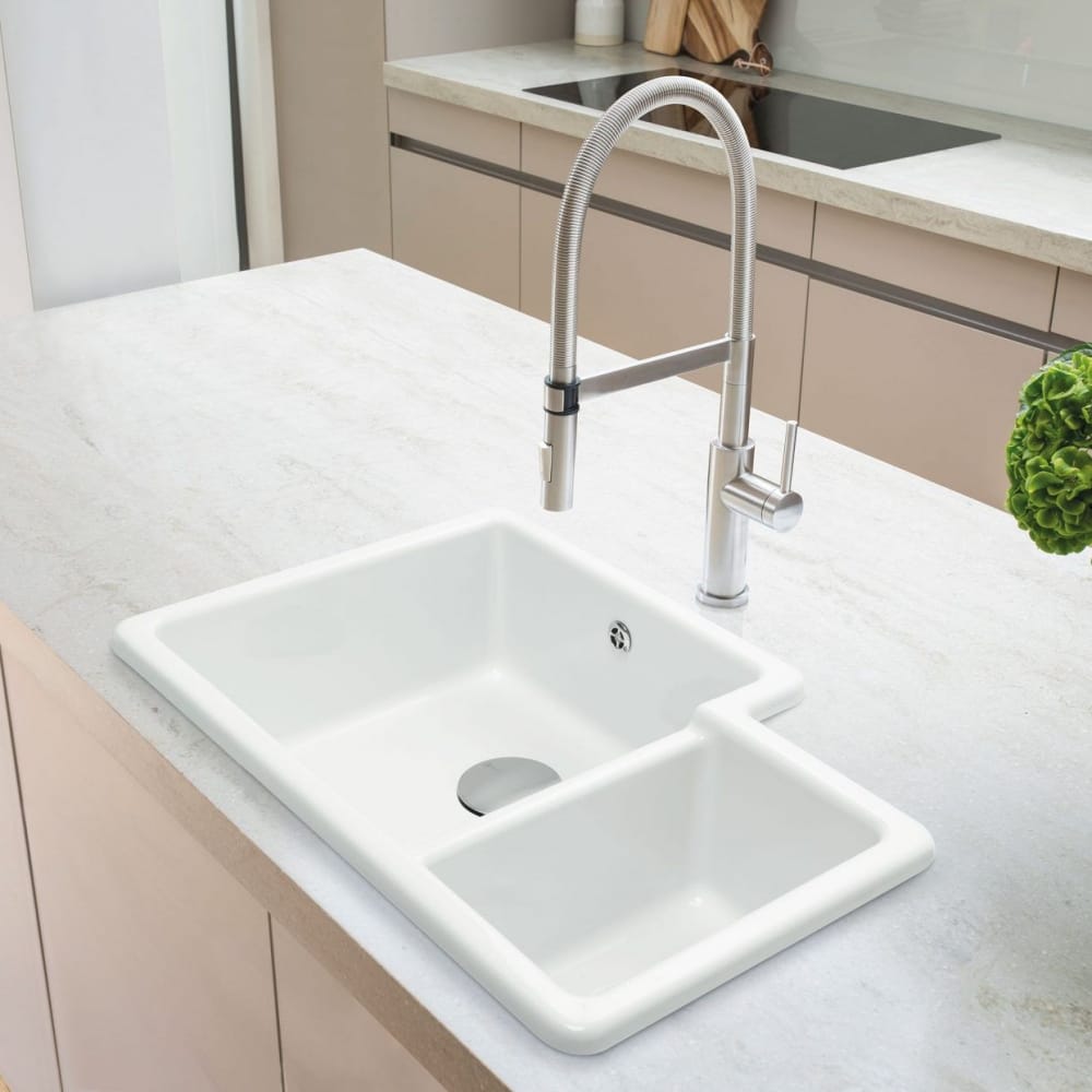 With a white ceramic finish, this 76cm wide Paladin sink from Caple looks superb. It features 2 bowls, with the smaller bowl on the right. Ceramic is a popular choice for sinks, and looks fantastic in a great range of kitchens. It is suitable for inset or undermount installation.