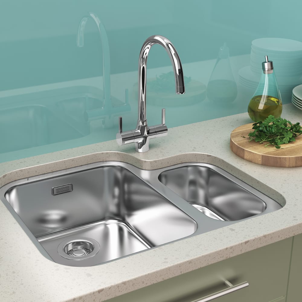 This Ariane undermount sink is perfect for when you need to wash your hands after already filling the bowl with hot water for the dishes. The silk steel finish is durable and hard wearing, while looking sleek and with an easy to maintain surface. This model has the small bowl on the right hand side.