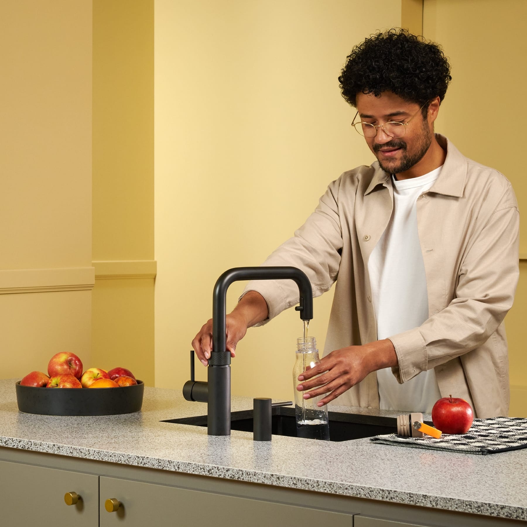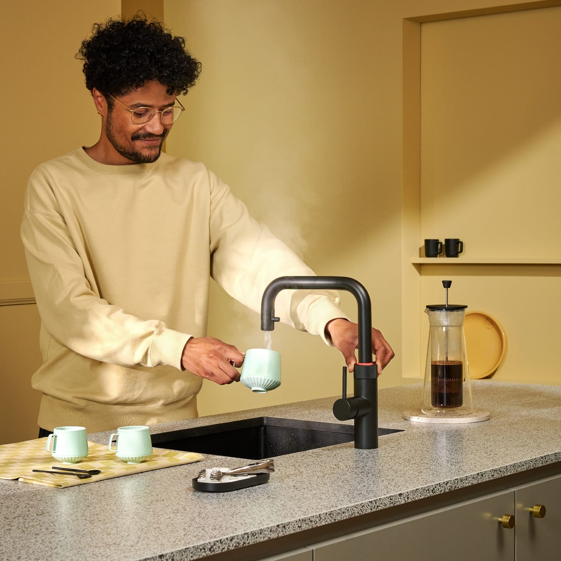 When you turn on the hot tap, Quooker checks the temperature straight off. If it’s not up to 40°C, Quooker adds just the right amount of boiling water so it’s always immediately hand-hot