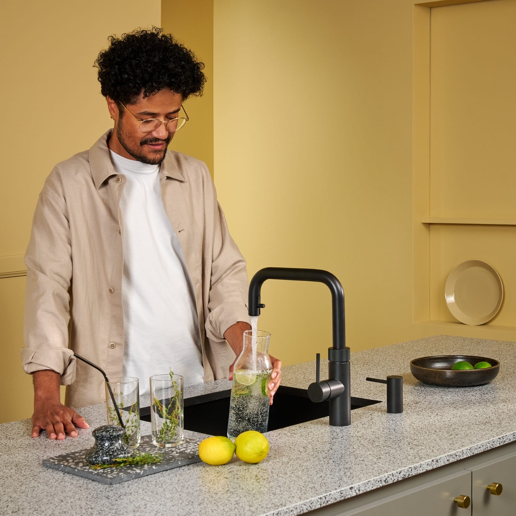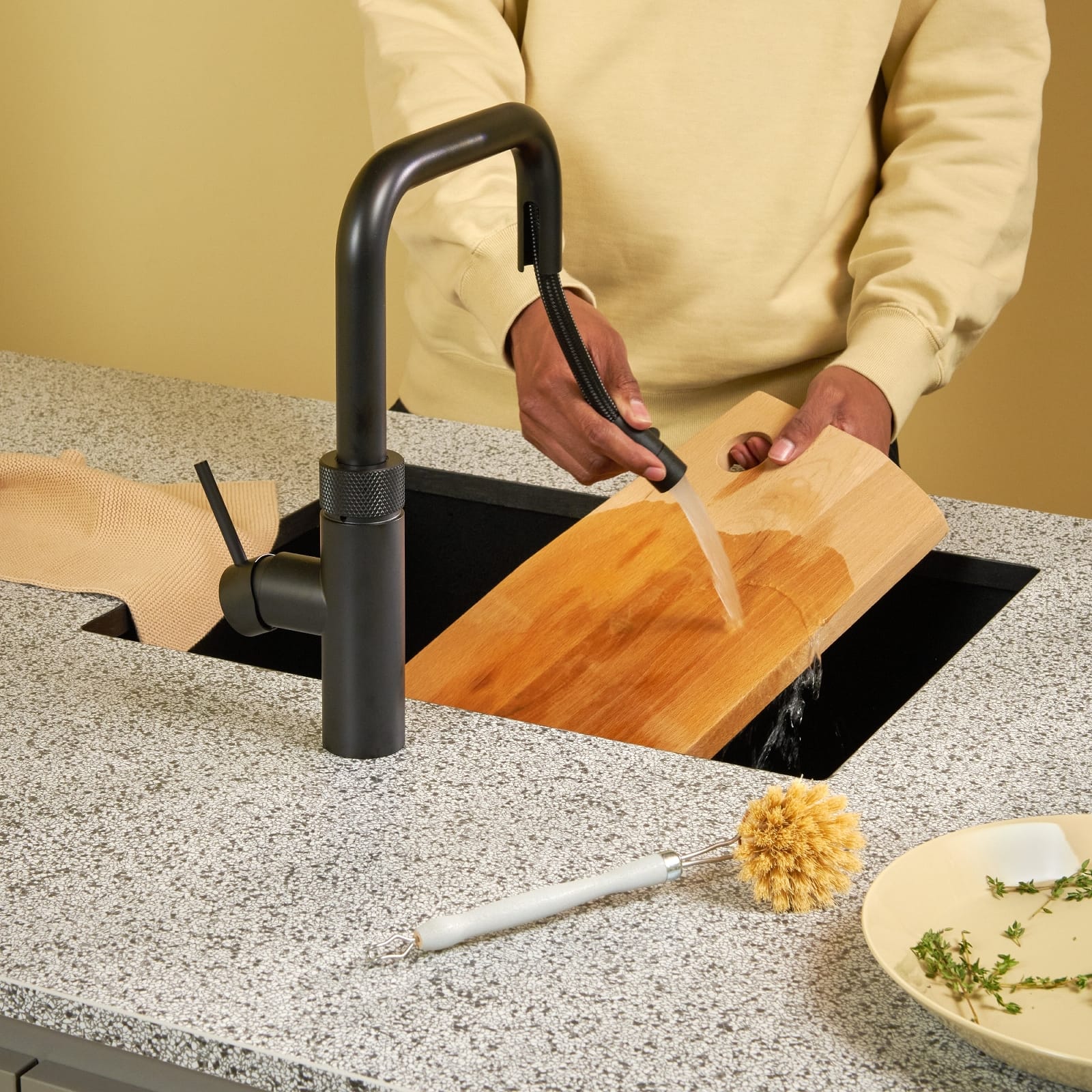 Unlike most European countries, we tend to pipe our kitchen’s hot water supply all the way from our main boiler, which can mean running the tap for some time before the hot water comes through, wasting time and energy. The Quooker Combi+ Flex delivers instant boiling water, cold water and hot water, all from a single tap. When you turn on the hot water, the Combi+ checks the temperature straight off, and if it is not up to 40°C, it adds just the right amount of boiling water from the tank so it’s always immediately hand-hot. This model is finished in black and comes with a seven litre tank.