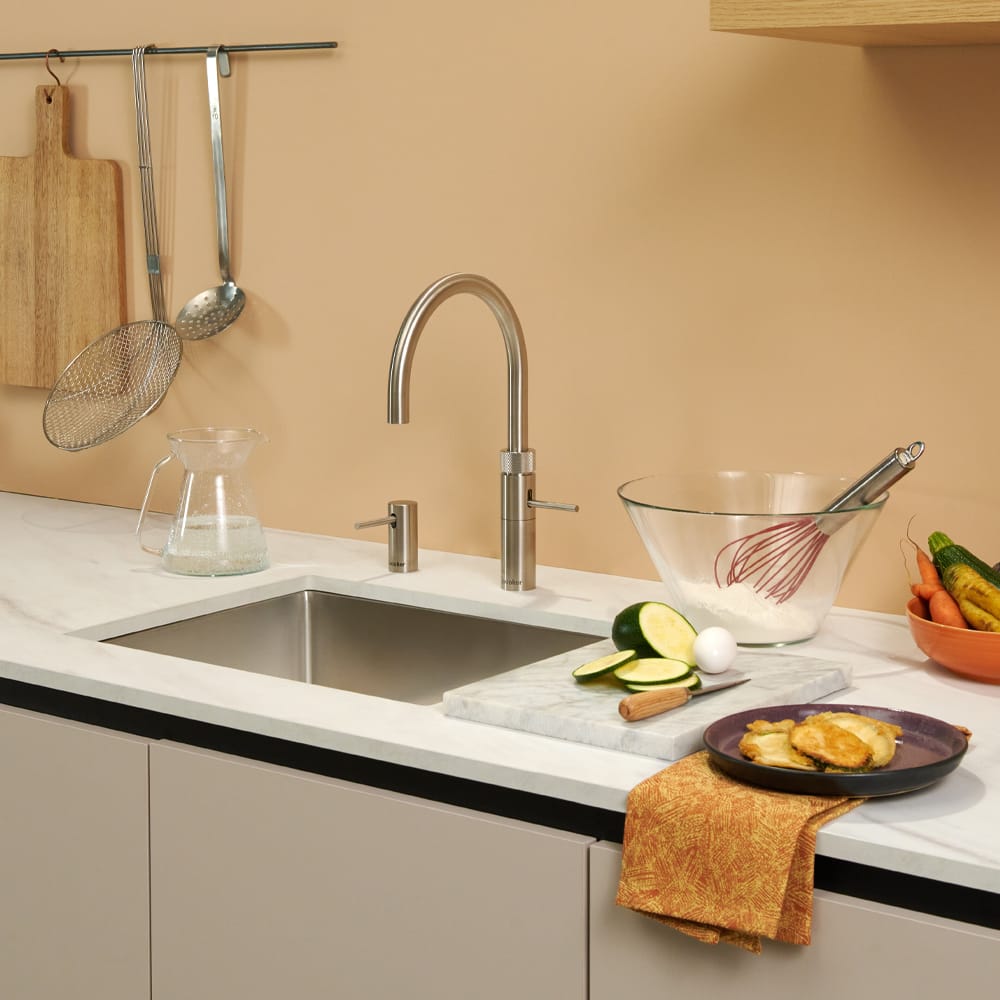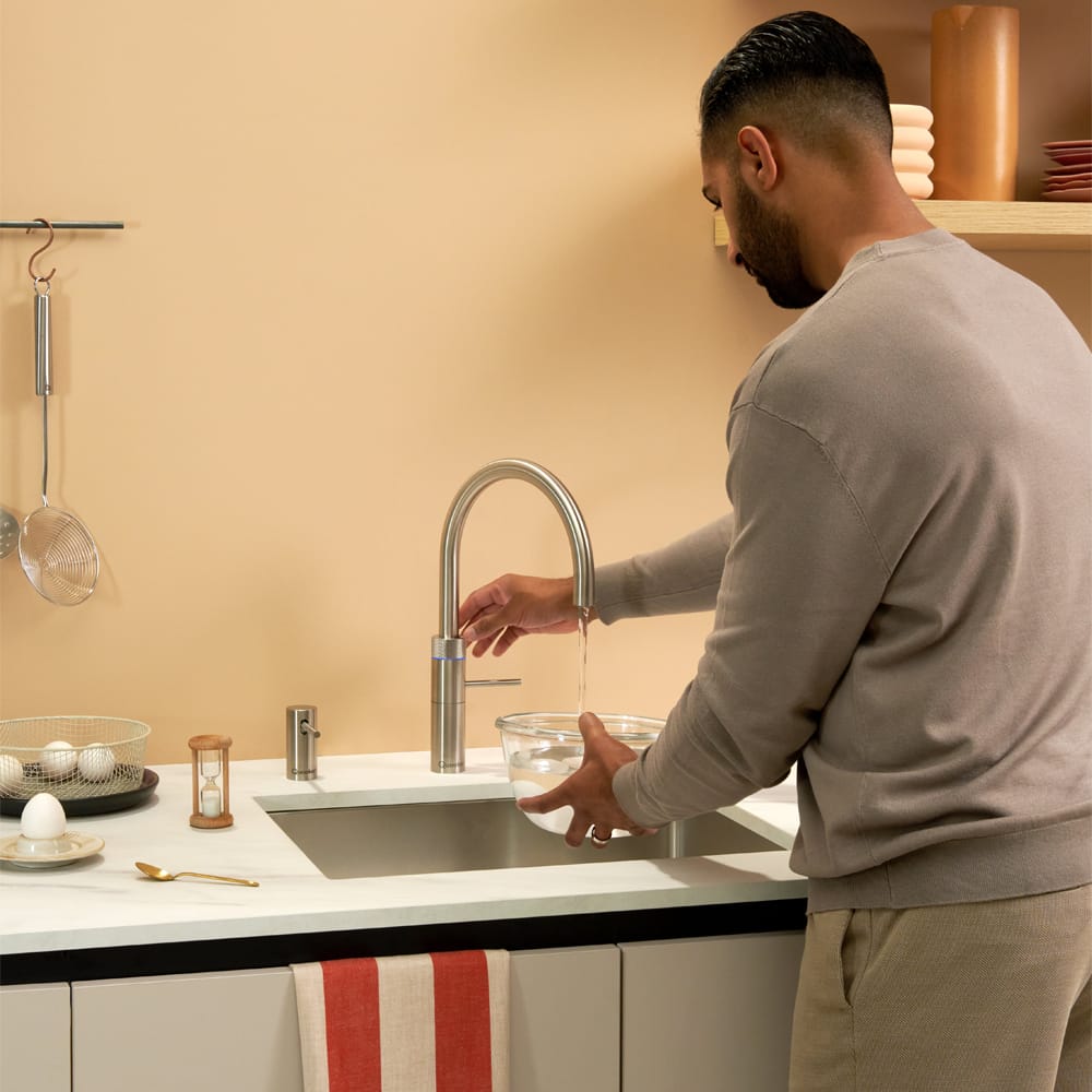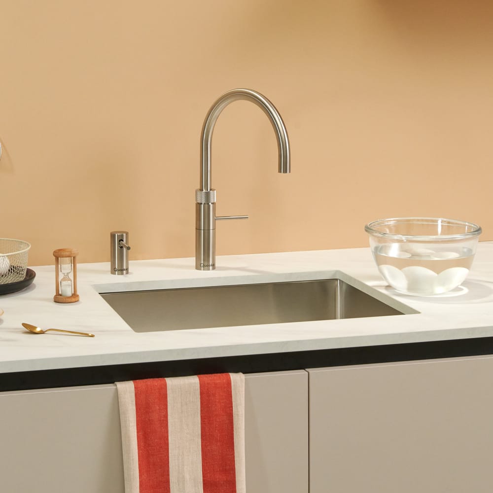 When you turn on the hot tap, Quooker checks the temperature straight off. If it’s not up to 40°C, Quooker adds just the right amount of boiling water so it’s always immediately hand-hot