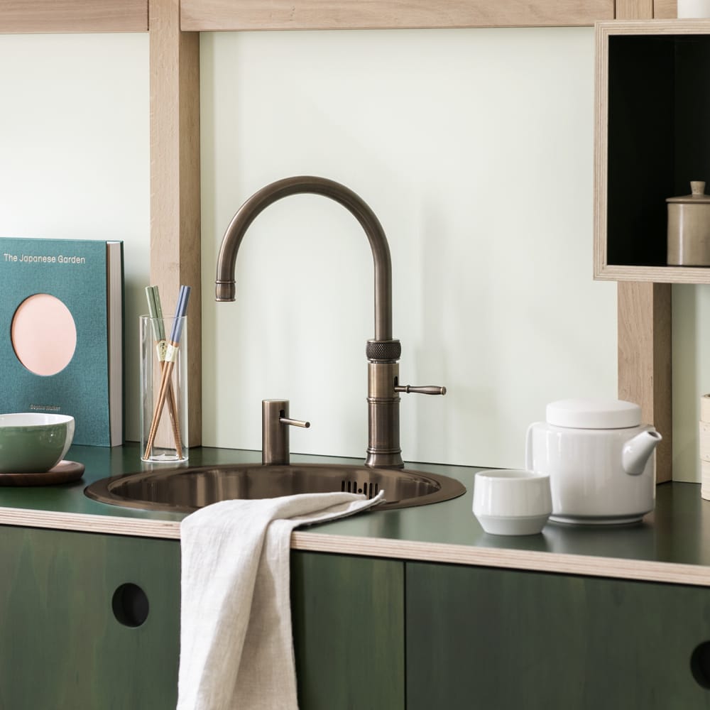 The Quooker Classic Fusion provides hot, cold and 100°C filtered boiling water from a single spout. Its high-vacuum insulation means that it only costs 3 pence a day to have boiling water at hand exactly when you want. This is the Classic Fusion Round model finished in patinated brass with a three litre water tank and it can be converted to a 4-in-1 model with the addition of the optional Cold Water Filter kit.