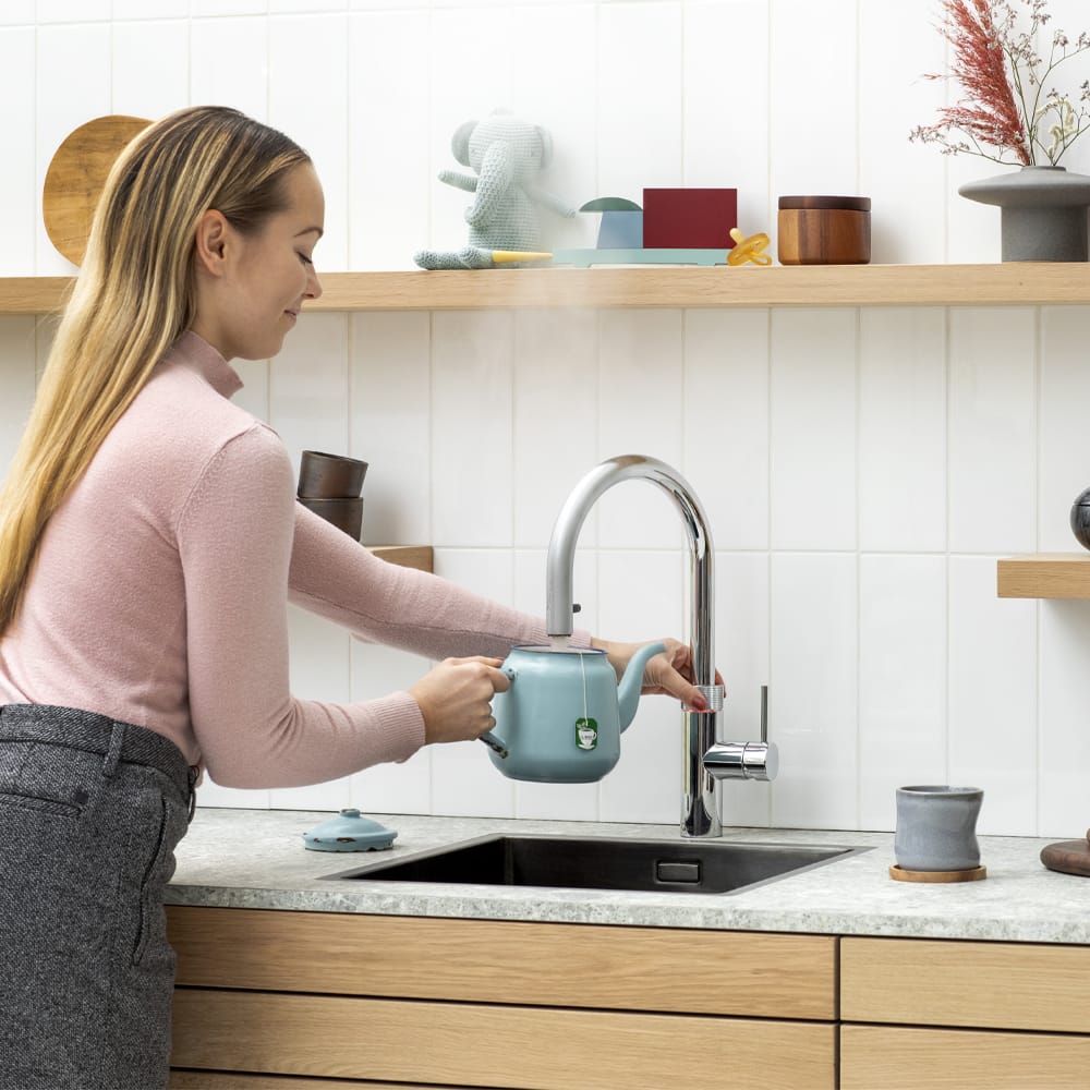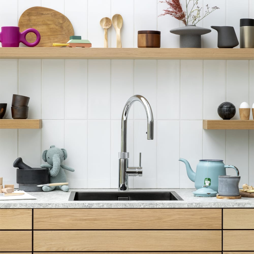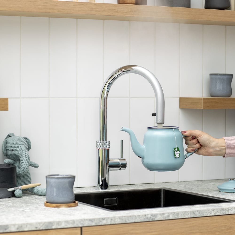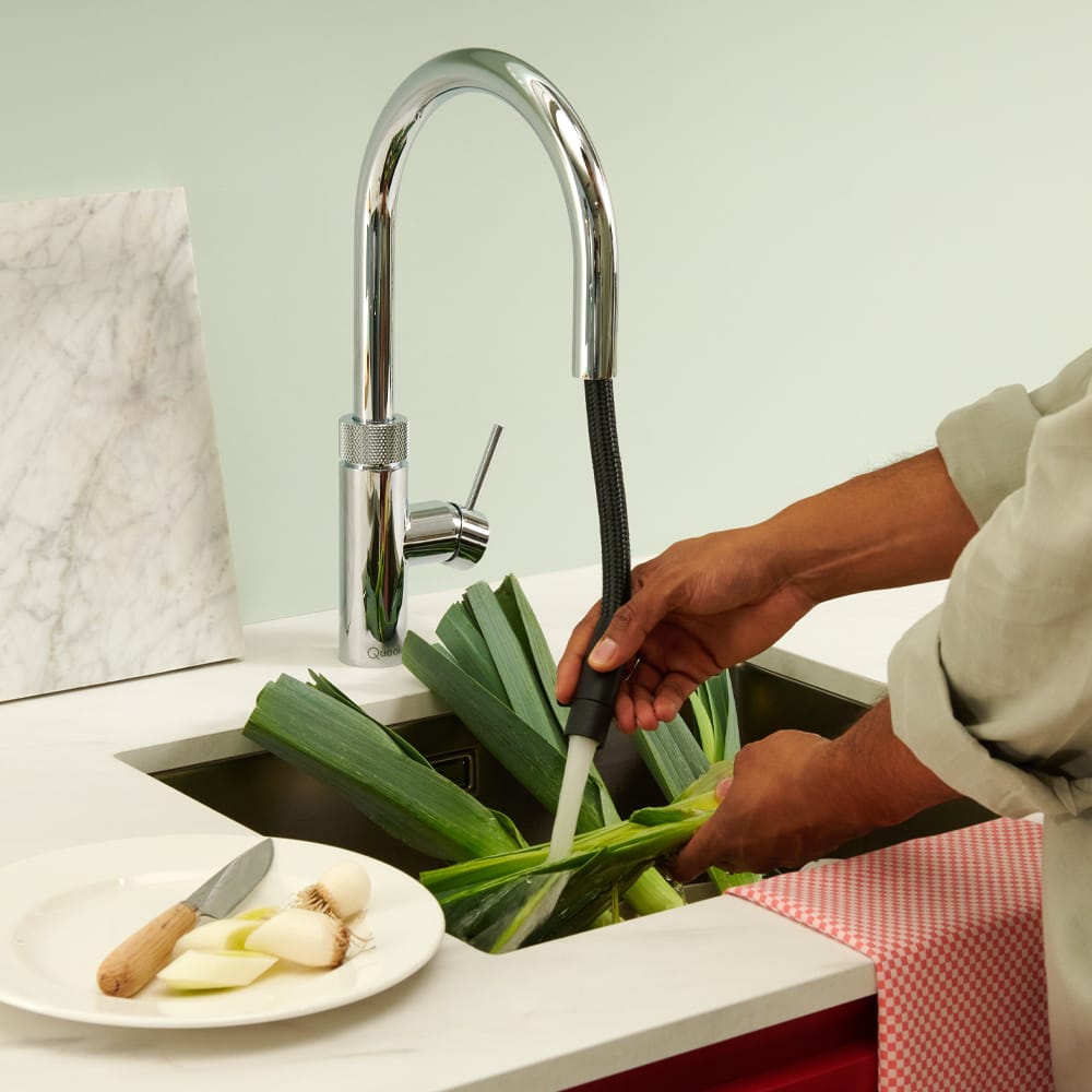 The Flex is the latest innovation from Quooker. A boiling water tap, equipped with a flexible pull out hose for hot, cold and filtered cold water with the optional cold water filter kit. Thanks to the boiling-water stop, the Flex will not dispense boiling water when the pull out hose is pulled out. The insulated spout and fine aerated spray ensure no risk of scalding or burning. This model is finished in chrome with a three litre water tank.